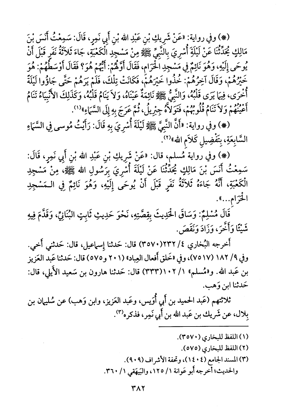 - وفي رواية مسلم، قال: «عن شريك بن عبد الله بن أبي نَمِر، قال: سمعت أَنس بن مالك يحدثنا عن ليلة أسري برسول الله صَلى الله عَليه وسَلم من مسجد الكعبة، أنه جاءه ثلاثة نفر قبل أن يوحى إليه، وهو نائم في المسجد الحرام».