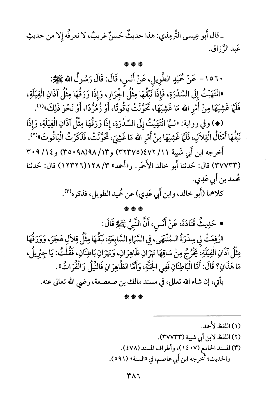 «رفعت لي سدرة المنتهى، في السماء السابعة، نبقها مثل قلال هجر، وورقها مثل آذان الفيلة، يخرج من ساقها نهران ظاهران، ونهران باطنان، فقلت: يا جبريل، ما هذان؟ قال: أما الباطنان ففي الجنة، وأما الظاهران فالنيل والفرات».