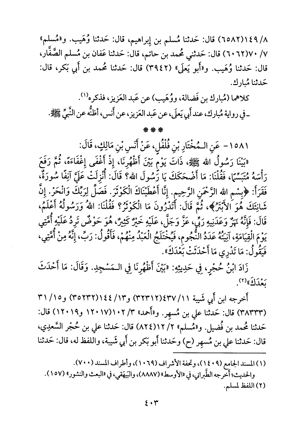 «بينا رسول الله صَلى الله عَليه وسَلم ذات يوم بين أظهرنا، إذ أغفى إغفاءة، ثم رفع رأسه متبسما، فقلنا: ما أضحكك يا رسول الله؟ قال: أنزلت علي آنفا سورة، فقرأ: {بسم الله الرَّحمَن الرحيم. إنا أعطيناك الكوثر. فصل لربك وانحر. إن شانئك هو الأبتر}، ثم قال: أتدرون ما الكوثر؟ فقلنا: الله ورسوله أعلم، قال: فإنه نهر وعدنيه ربي، عز وجل، عليه خير كثير، هو حوض ترد عليه أمتي يوم القيامة، آنيته عدد النجوم، فيختلج العبد منهم، فأقول: رب، إنه من أمتي، فيقول: ما تدري ما أحدثت بعدك».