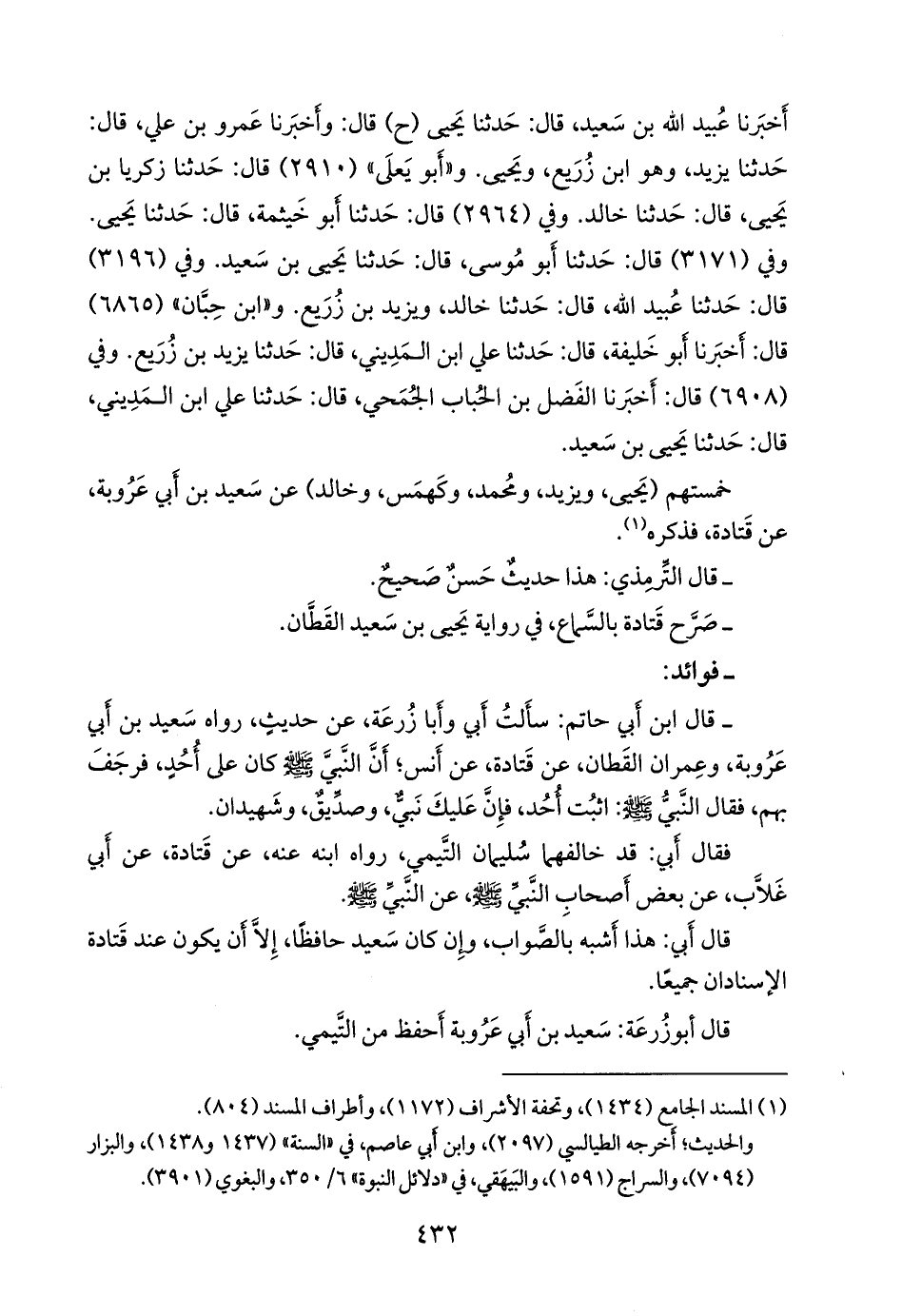 - قال ابن أبي حاتم: سألت أبي وأَبا زُرعَة، عن حديث، رواه سعيد بن أبي عَروبَة، وعمران القطان، عن قتادة، عن أَنس؛ أن النبي صَلى الله عَليه وسَلم كان على أحد، فرجف بهم، فقال النبي صَلى الله عَليه وسَلم: اثبت أحد، فإن عليك نبي، وصديق، وشهيدان.