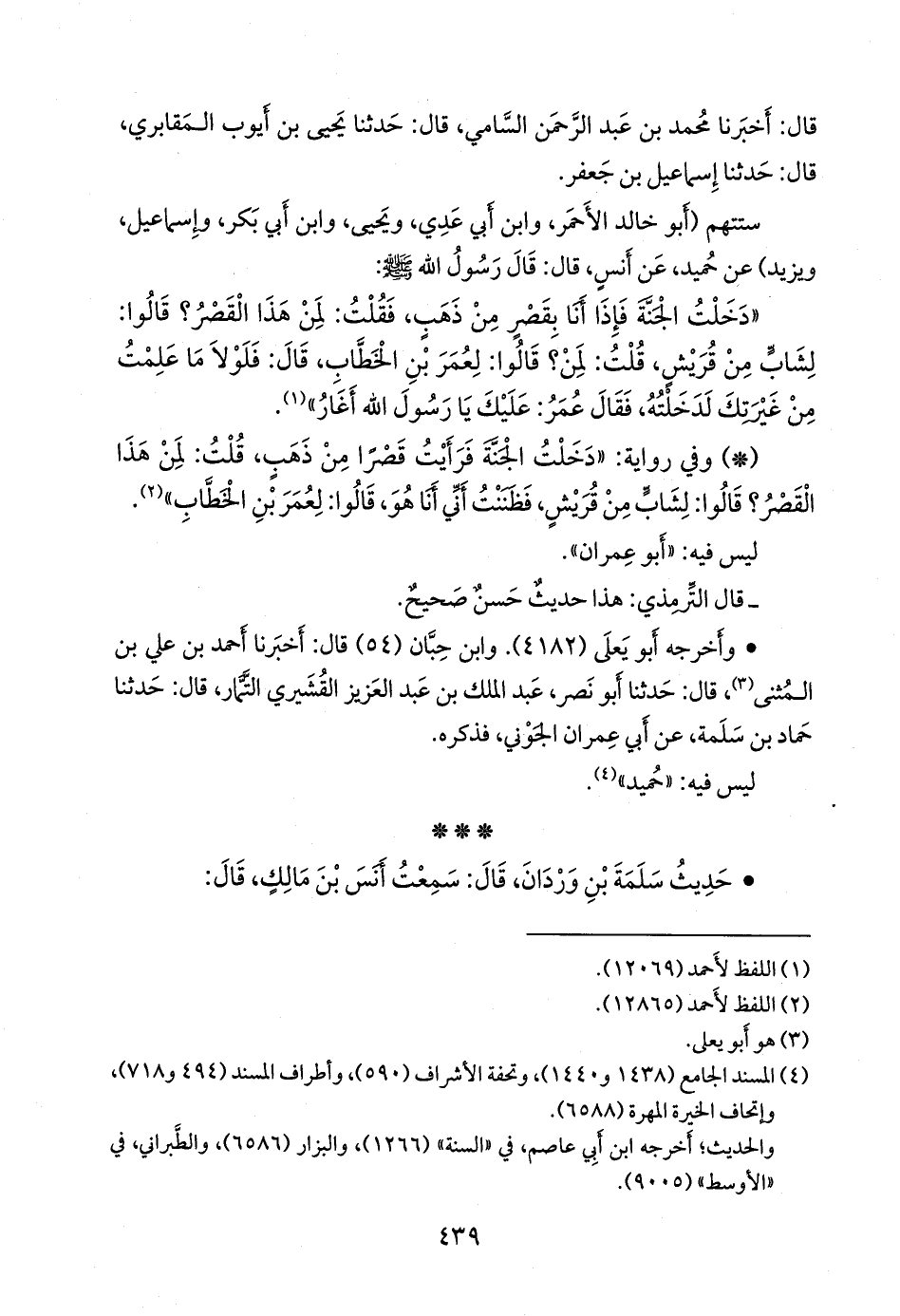 ستتهم (أَبو خالد الأَحمر سليمان بن حَيَّان، ومحمد بن أَبي عَدي، ويحيى بن سعيد القطان، وعبد الله بن بكر، وإسماعيل، ويزيد) عن حُميد بن أَبي حُميد الطويل، عن أَنس، قال: قال رسول الله صَلى الله عَليه وسَلم: