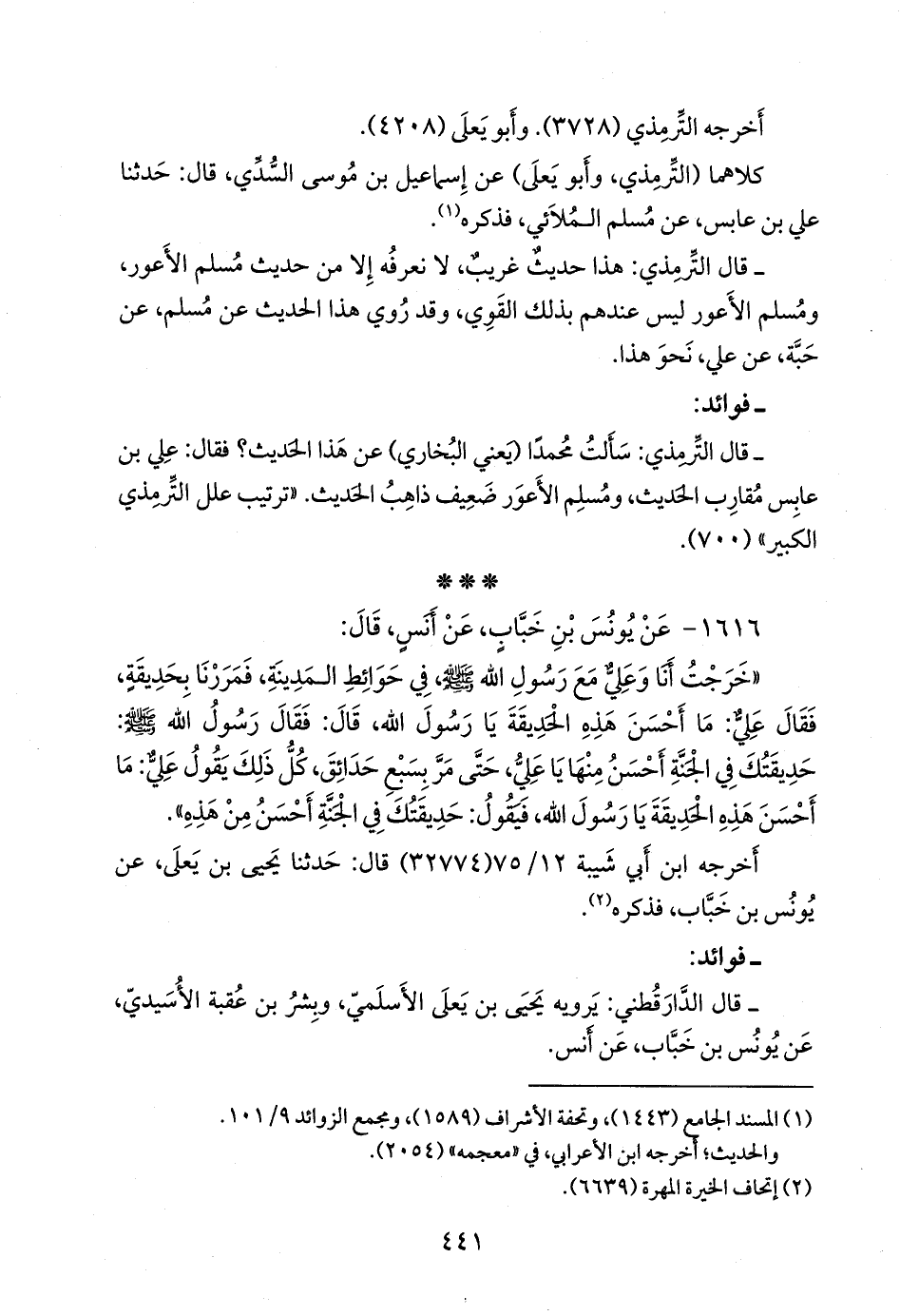 - قلنا: إِسناده ضعيفٌ؛ قال ابن الجُنيد: سأل رجل يحيى بن مَعين، وأَنا أَسمع، عن يونس بن خَبَّاب؟ فقال: ليس بذاك، كان يشتم أَصحاب النبي صَلى الله عَليه وسَلم كان يشتم عثمان، ومَن شتم أَصحاب النبي صَلى الله عَليه وسَلم فليس بثِقَة. (٩١٦).