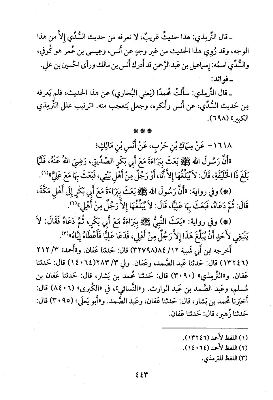 - وفي رواية: «أن رسول الله صَلى الله عَليه وسَلم بعث ببراءة مع أَبي بكر إلى أهل مكة، قال: ثم دعاه، فبعث بها عليا، قال: لا يبلغها إلا رجل من أهلي» (¬٢).