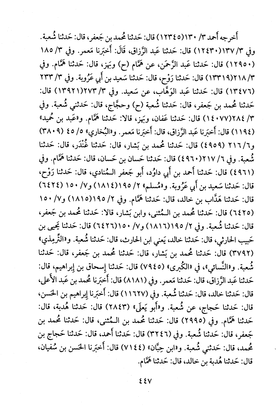 وفي ٣/ ٢٨٤ (١٤٠٧٧) قال: حدثنا عفان، وبَهز، قالا: حدثنا همام. و «عَبد بن حُميد» (١١٩٤) قال: أخبرنا عبد الرزاق، قال: أخبرنا مَعمَر. و «البخاري» ٥/ ٣٦ (٣٨٠٩) و ٦/ ١٧٥ (٤٩٥٩) قال: حدثنا محمد بن بشار، قال: حدثنا غُندَر، قال: حدثنا شعبة. وفي ٦/ ١٧٥ (٤٩٦٠) قال: حدثنا حسان بن حسان، قال: حدثنا همام. وفي (٤٩٦١) قال: حدثنا أحمد بن أبي داود، أَبو جعفر المنادي، قال: حدثنا روح، قال: حدثنا سعيد بن أبي عَروبَة. و «مسلم» ٢/ ١٩٥ (١٨١٤) و ٧/ ١٥٠ (٦٤٢٤) قال: حدثنا هداب بن خالد، قال: حدثنا همام. وفي ٢/ ١٩٥ (١٨١٥) و ٧/ ١٥٠ (٦٤٢٥) قال: حدثنا محمد بن المثنى، وابن بشار، قالا: حدثنا محمد بن جعفر، قال: حدثنا شعبة. وفي ٢/ ١٩٥ (١٨١٦) و ٧/ ١٥٠ (٦٤٢٦) قال: حدثنا يحيى بن حبيب الحارثي، قال: حدثنا خالد، يعني ابن الحارث، قال: حدثنا شعبة. و «التِّرمِذي» (٣٧٩٢) قال: حدثنا محمد بن بشار، قال: حدثنا محمد بن جعفر، قال: حدثنا شعبة. و «النَّسَائي» في «الكبرى» (٧٩٤٥) قال: حدثنا إسحاق بن إبراهيم، قال: حدثنا عبد الرزاق، قال: حدثنا مَعمَر. وفي (٨١٨١) قال: أخبرنا محمد بن عبد الأعلى، قال: حدثنا خالد، قال: حدثنا شعبة. وفي (١١٦٢٧) قال: أخبرنا إبراهيم بن الحسن، قال: حدثنا حجاج، عن شعبة. و «أَبو يَعلى» (٢٨٤٣) قال: حدثنا هُدبة، قال: حدثنا همام. وفي (٢٩٩٥) قال: حدثنا محمد بن المثنى، قال: حدثنا محمد بن جعفر، قال: حدثنا شعبة. وفي (٣٢٤٦) قال: حدثنا أحمد، قال: حدثنا حجاج بن محمد، قال: حدثني شعبة. و «ابن حِبَّان» (٧١٤٤) قال: أخبرنا الحسن بن سفيان، قال: حدثنا هُدبة بن خالد، قال: حدثنا همام.