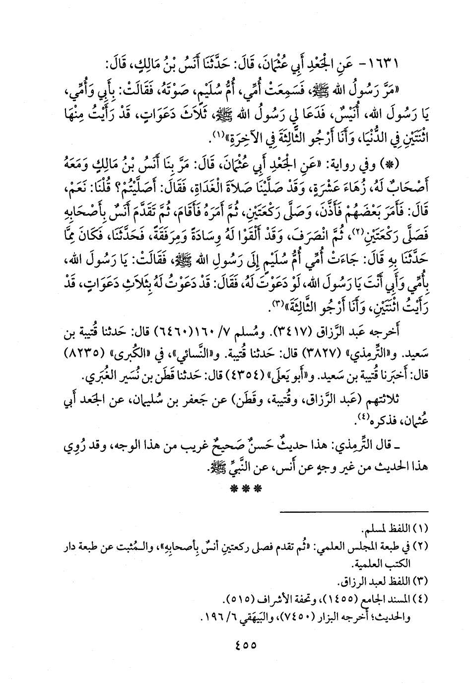 - وفي رواية: «عن الجعد أبي عثمان، قال: مر بنا أَنس بن مالك ومعه أصحاب له، زهاء عشرة، وقد صلينا صلاة الغداة، فقال: أصليتم؟ قلنا: نعم، قال: فأمر بعضهم فأذن، وصلى ركعتين، ثم أمره فأقام، ثم تقدم فصلى ركعتين أَنسٌ بأصحابه، ثم انصرف، وقد ألقوا له وسادة ومرفقة، فحدثنا، فكان مما حدثنا به قال: جاءت أمي أُم سُليم إلى رسول الله صَلى الله عَليه وسَلم فقالت: يا رسول الله، بأمي وأبي أنت يا رسول الله، لو دعوت له، فقال: قد دعوت له بثلاث دعوات، قد رأيت اثنتين، وأنا أرجو الثالثة» (¬٢).