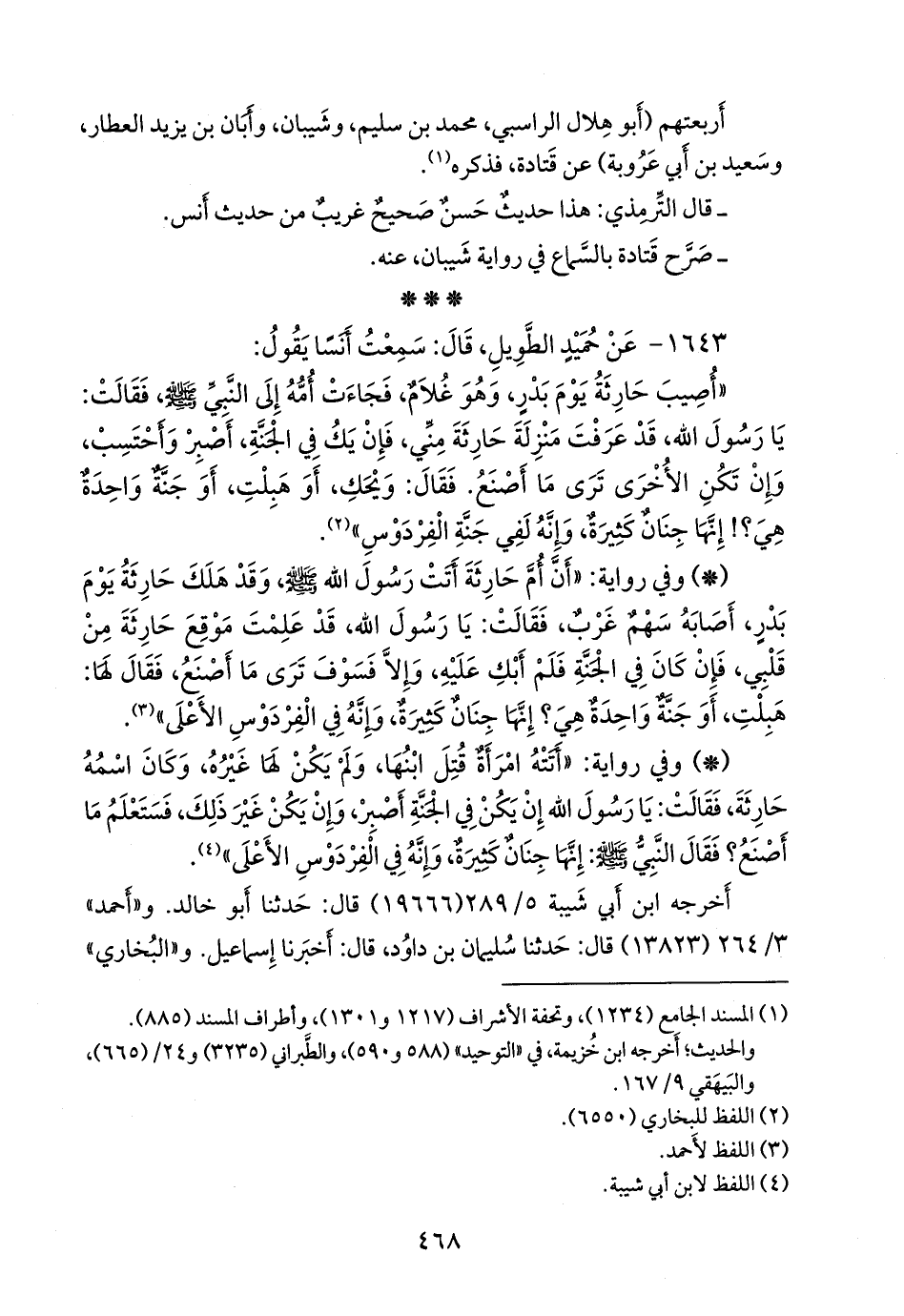 «أصيب حارثة يوم بدر، وهو غلام، فجاءت أمه إلى النبي صَلى الله عَليه وسَلم فقالت: يا رسول الله، قد عرفت منزلة حارثة مني، فإن يك في الجنة، أصبر وأحتسب، وإن تكن الأخرى ترى ما أصنع. فقال: ويحك، أو هبلت، أو جنة واحدة هي؟! إنها جنان كثيرة، وإنه لفي جنة الفردوس» (¬١).