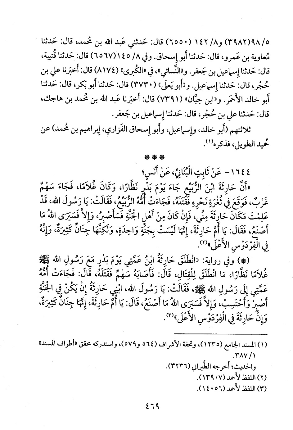 - وفي رواية: «انطلق حارثة ابن عمتي يوم بدر مع رسول الله صَلى الله عَليه وسَلم غلاما نظارا، ما انطلق للقتال، قال: فأصابه سهم فقتله، قال: فجاءت أمه عمتي إلى رسول الله صَلى الله عَليه وسَلم فقالت: يا رسول الله، ابني حارثة إن يكن في الجنة أصبر وأحتسب، وإلا فسيرى الله ما أصنع، قال: يا أُم حارثة، إنها جنان كثيرة، وإن حارثة في الفردوس الأعلى» (¬٢).