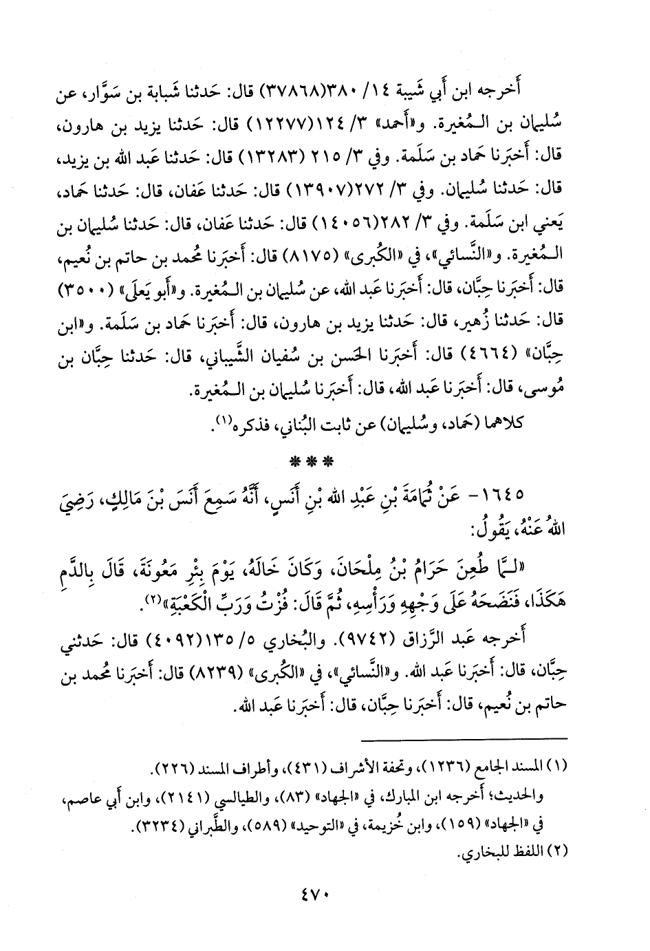 وفي (١٣٢٨٣) قال: حدثنا عبد الله بن يزيد، قال: حدثنا سليمان. وفي (١٣٩٠٧) قال: حدثنا عفان، قال: حدثنا حماد، يعني ابن سلمة. وفي (١٤٠٥٦) قال: حدثنا عفان، قال: حدثنا سليمان بن المغيرة. و «النَّسَائي» في «الكبرى» (٨١٧٥) قال: أخبرنا محمد بن حاتم بن نعيم، قال: أخبرنا حبان، قال: أخبرنا عبد الله، عن سليمان بن المغيرة. و «أَبو يَعلى» (٣٥٠٠) قال: حدثنا زهير، قال: حدثنا يزيد بن هارون، قال: أخبرنا حماد بن سلمة. و «ابن حِبَّان» (٤٦٦٤) قال: أخبرنا الحسن بن سفيان الشيباني، قال: حدثنا حِبَّان بن موسى، قال: أخبرنا عبد الله، قال: أخبرنا سليمان بن المغيرة.
