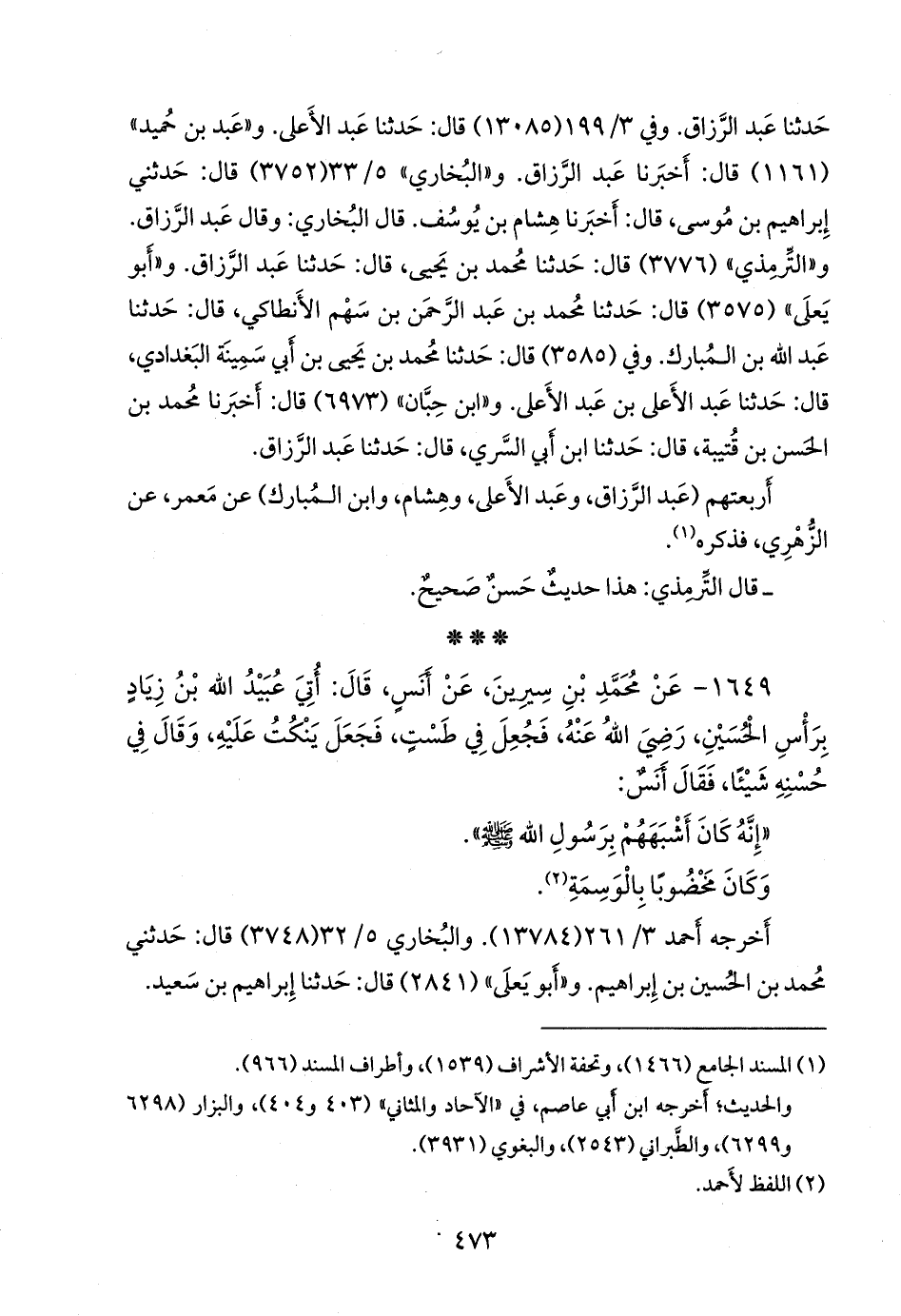١٦٤٩ - عن محمد بن سِيرين، عن أَنس، قال: أتي عُبيد الله بن زياد برأس الحسين، رضي الله عنه، فجعل في طست، فجعل ينكت عليه، وقال في حسنه شيئا، فقال أنس: