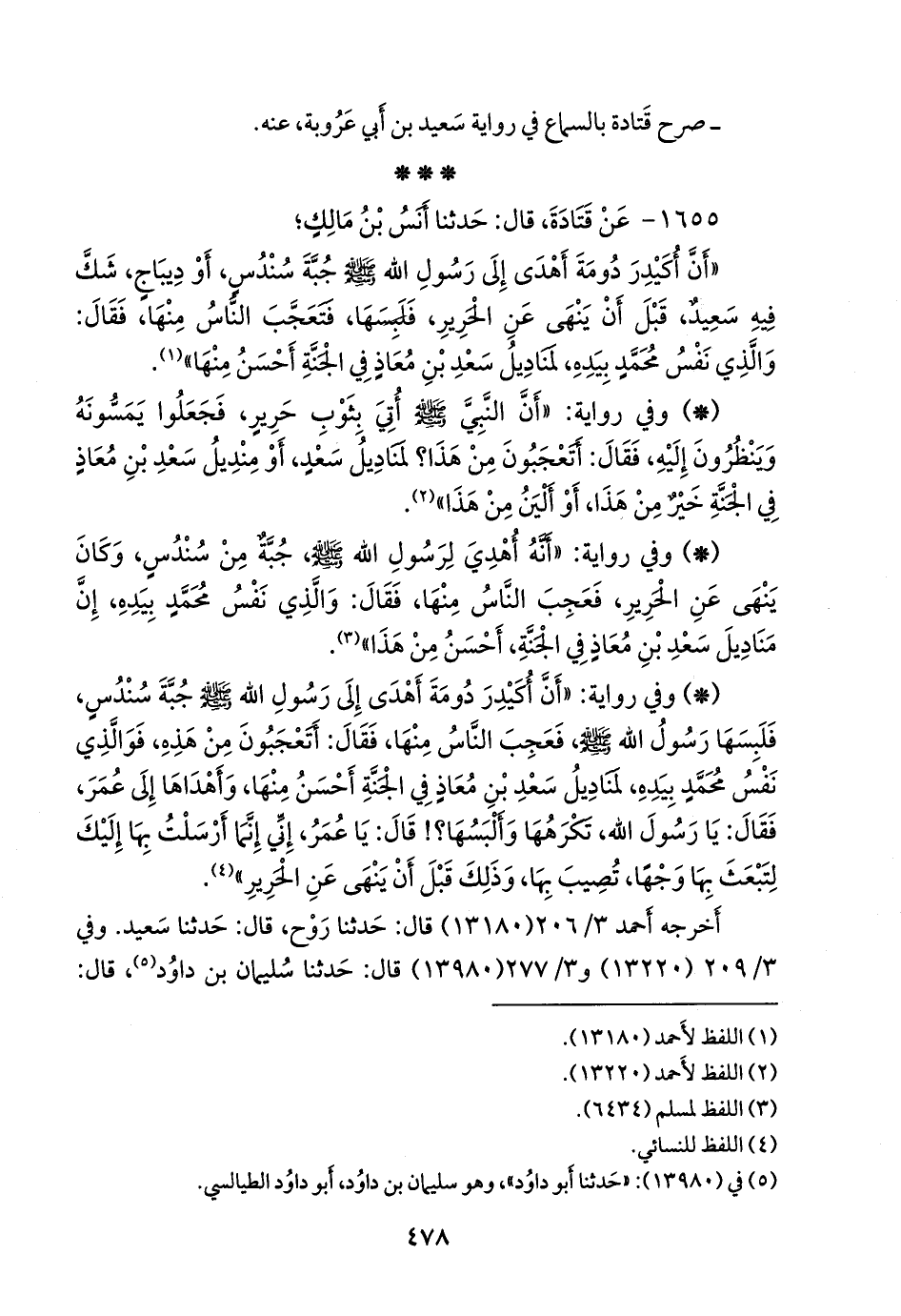 «أن أكيدر دومة أهدى إلى رسول الله صَلى الله عَليه وسَلم جبة سندس، أو ديباج، شك فيه سعيد، قبل أن ينهى عن الحرير، فلبسها، فتعجب الناس منها، فقال: والذي نفس محمد بيده، لمناديل سعد بن معاذ في الجنة أحسن منها» (¬١).