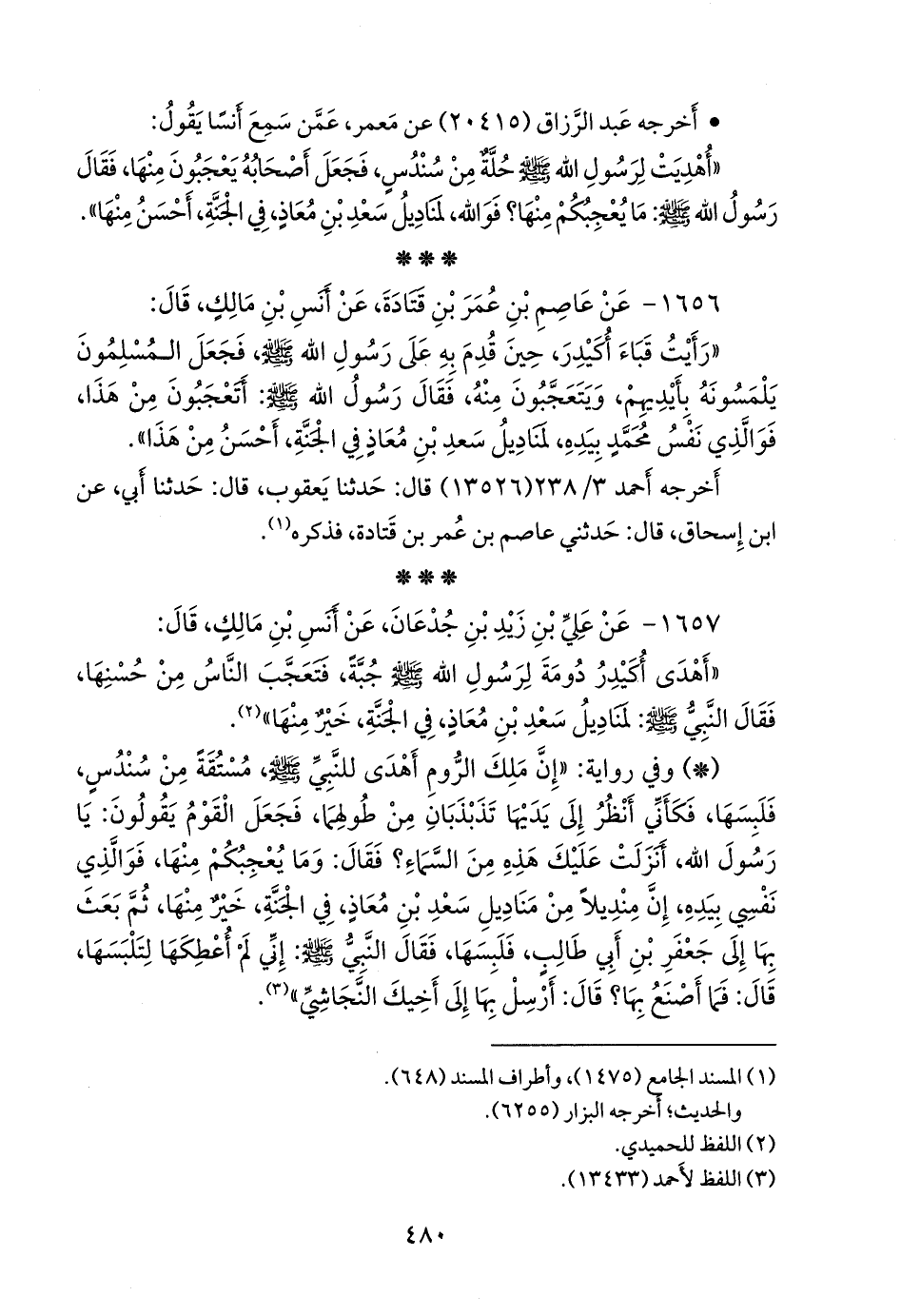 - وفي رواية: «إن ملك الروم أهدى للنبي صَلى الله عَليه وسَلم مستقة من سندس، فلبسها، فكأني أنظر إلى يديها تذبذبان من طولهما، فجعل القوم يقولون: يا رسول الله، أنزلت عليك هذه من السماء؟ فقال: وما يعجبكم منها، فوالذي نفسي بيده، إن منديلا من مناديل سعد بن معاذ، في الجنة، خير منها، ثم بعث بها إلى جعفر بن أبي طالب، فلبسها، فقال النبي صَلى الله عَليه وسَلم: إني لم أعطكها لتلبسها، قال: فما أصنع بها؟ قال: أرسل بها إلى أخيك النجاشي» (¬٢).