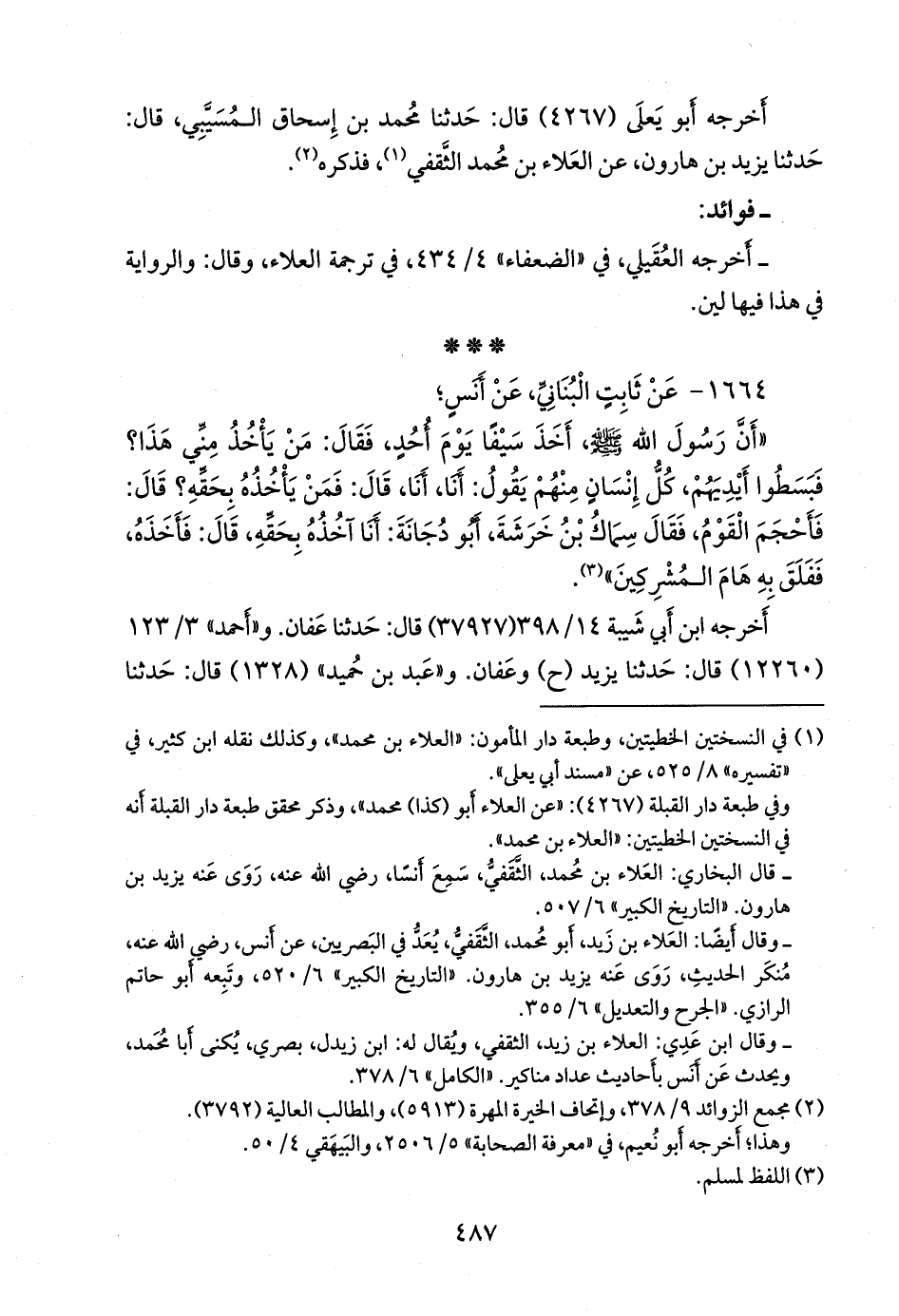 ثلاثتهم (عفان، ويزيد، وابن الفضل) عن حماد بن سلمة، قال: حدثنا ثابت، فذكره (¬٢).