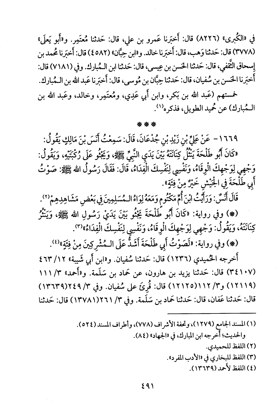 - وفي رواية: «كان أَبو طلحة يجثو بين يدي رسول الله صَلى الله عَليه وسَلم وينثر كنانته، ويقول: وجهي لوجهك الوقاء، ونفسي لنفسك الفداء» (¬٢).