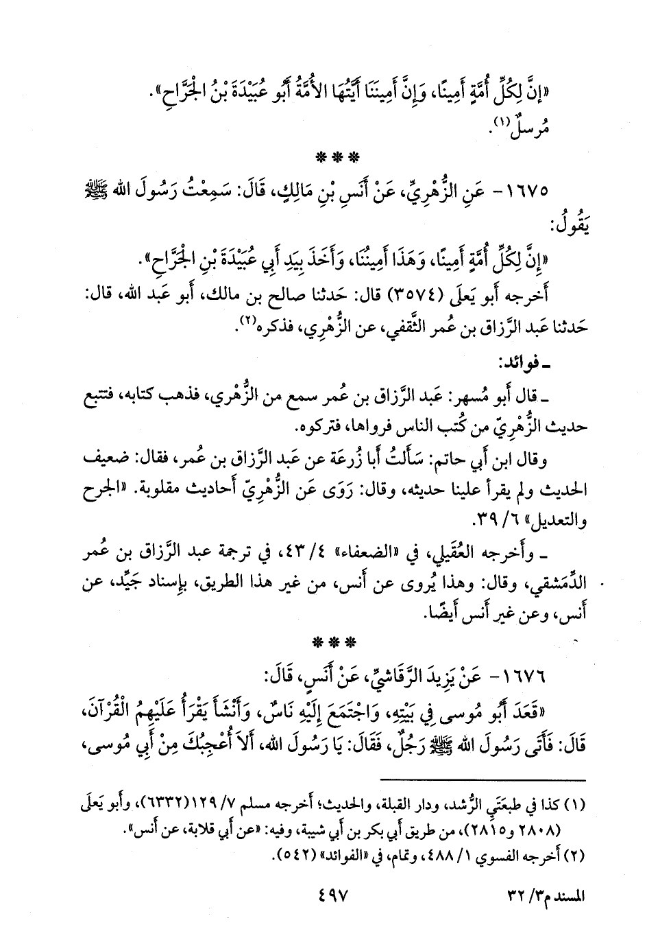 - قلنا: إِسناده ضعيفٌ؛ قال عبد الرَّحمَن بن أَبي حاتم الرازي: سمعتُ أَبي يقول: قال أَبو مُسهِر: عبد الرزاق بن عُمر سمع من الزُّهْري، فذهب كتابه، فتتبع حديث الزُّهْري من كتب الناس فرواها، فتركوه.