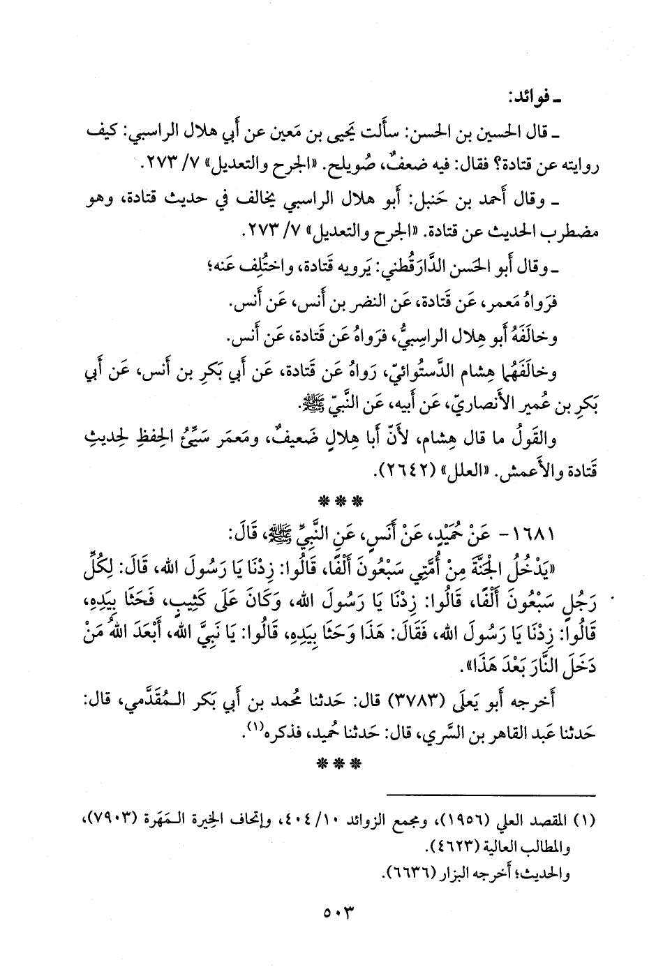 - قلنا: قال الحسين بن الحسن: سألت يحيى بن مَعين عن أبي هلال الراسبي: كيف روايته عن قتادة؟ فقال: فيه ضعف, صويلح. «الجرح والتعديل» ٧/ ٢٧٣.