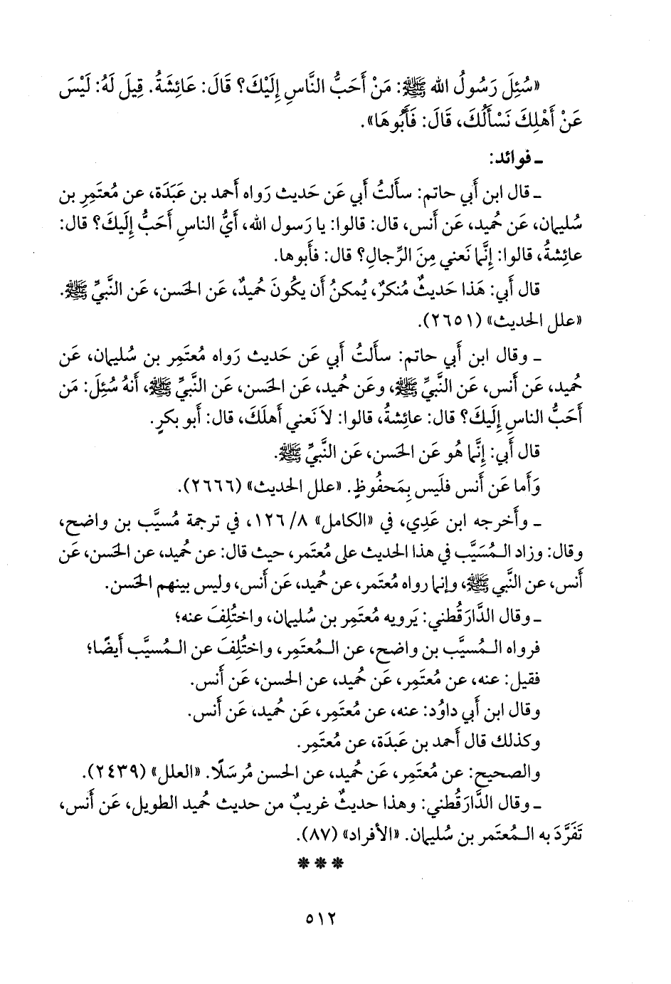 - وقال ابن أبي حاتم: سألت أبي عن حديث رواه مُعتَمِر بن سليمان، عن حميد، عن أَنس، عن النبي صَلى الله عَليه وسَلم وعن حميد، عن الحسن، عن النبي صَلى الله عَليه وسَلم أنه سئل: من أحب الناس إليك؟ قال: عائشة، قالوا: لا نعني أهلك، قال: أَبو بكر.