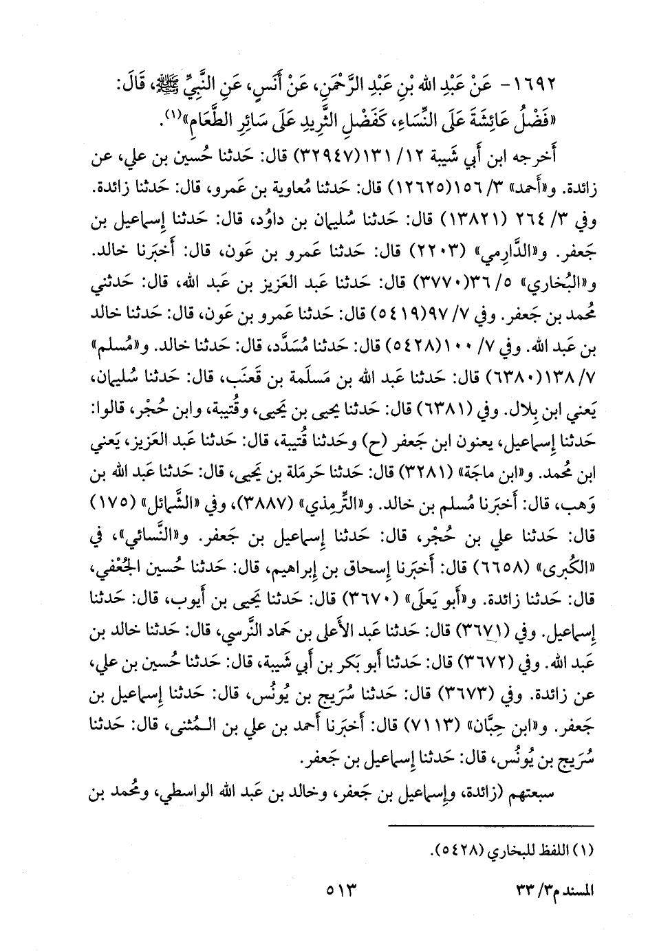 أخرجه ابن أبي شيبة (٣٢٩٤٧) قال: حدثنا حسين بن علي، عن زائدة. و «أحمد» ٣/ ١٥٦ (١٢٦٢٥) قال: حدثنا معاوية بن عَمرو، قال: حدثنا زائدة. وفي ٣/ ٢٦٤ (١٣٨٢١) قال: حدثنا سليمان بن داود، قال: حدثنا إسماعيل بن جعفر. و «الدَّارِمي» (٢٢٠٣) قال: حدثنا عَمرو بن عون، قال: أخبرنا خالد. و «البخاري» ٥/ ٢٩ (٣٧٧٠) قال: حدثنا عبد العزيز بن عبد الله، قال: حدثني محمد بن جعفر. وفي ٧/ ٧٥ (٥٤١٩) قال: حدثنا عَمرو بن عون، قال: حدثنا خالد بن عبد الله. وفي ٧/ ٧٧ (٥٤٢٨) قال: حدثنا مُسدد، قال: حدثنا خالد. و «مسلم» ٧/ ١٣٨ (٦٣٨٠) قال: حدثنا عبد الله بن مَسلَمة بن قعنب، قال: حدثنا سليمان، يعني ابن بلال. وفي (٦٣٨١) قال: حدثنا يحيى بن يحيى، وقتيبة، وابن حجر، قالوا: حدثنا إسماعيل، يعنون ابن جعفر (ح) وحدثنا قتيبة، قال: حدثنا عبد العزيز، يعني ابن محمد. و «ابن ماجة» (٣٢٨١) قال: حدثنا حَرملة بن يحيى، قال: حدثنا عبد الله بن وهب، قال: أخبرنا مسلم بن خالد. و «التِّرمِذي» (٣٨٨٧)، وفي «الشمائل» (١٧٥) قال: حدثنا علي بن حُجْر، قال: حدثنا إسماعيل بن جعفر. و «النَّسَائي» في «الكبرى» (٦٦٥٨) قال: أخبرنا إسحاق بن إبراهيم، قال: حدثنا حسين الجعفي، قال: حدثنا زائدة. و «أَبو يَعلى» (٣٦٧٠) قال: حدثنا يحيى بن أيوب، قال: حدثنا إسماعيل. وفي (٣٦٧١) قال: حدثنا عبد الأعلى بن حماد النَّرْسي، قال: حدثنا خالد بن عبد الله. وفي (٣٦٧٢) قال: حدثنا أَبو بكر بن أبي شيبة، قال: حدثنا حسين بن علي، عن زائدة. وفي (٣٦٧٣) قال: حدثنا سريج بن يونس، قال: حدثنا إسماعيل بن جعفر. و «ابن حِبَّان» (٧١١٣) قال: أخبرنا أحمد بن علي بن المثنى، قال: حدثنا سريج بن يونس، قال: حدثنا إسماعيل بن جعفر.
