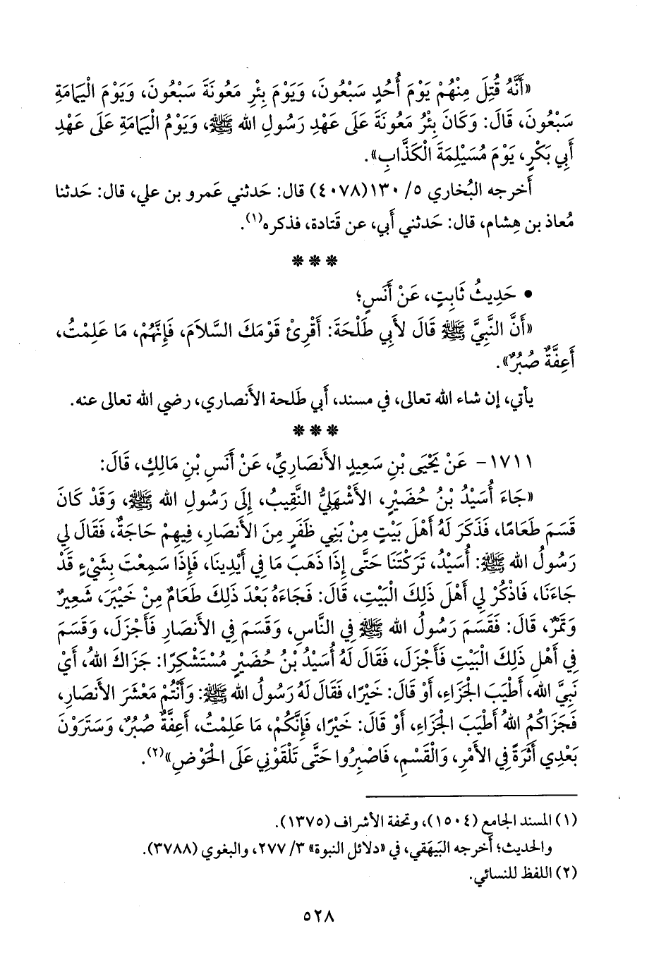 «جاء أُسيد بن حُضير، الأشهلي النقيب، إلى رسول الله صَلى الله عَليه وسَلم وقد كان قسم طعاما، فذكر له أهل بيت من بني ظفر من الأنصار، فيهم حاجة، فقال لي رسول الله صَلى الله عَليه وسَلم: أسيد، تركتنا حتى إذا ذهب ما في أيدينا، فإذا سمعت بشيء قد جاءنا، فاذكر لي أهل ذلك البيت، قال: فجاءه بعد ذلك طعام من خيبر، شعير وتمر، قال: فقسم رسول الله صَلى الله عَليه وسَلم في الناس، وقسم في الأنصار فأجزل، وقسم في أهل ذلك البيت فأجزل، فقال له أُسيد بن حُضير مستشكرا: جزاك الله، أي نبي الله، أطيب الجزاء، أو قال: خيرا، فقال له رسول الله صَلى الله عَليه وسَلم: وأنتم معشر الأنصار، فجزاكم الله أطيب الجزاء، أو قال: خيرا، فإنكم، ما علمت، أعفة صبر، وسترون بعدي أثرة في الأمر، والقسم، فاصبروا حتى تلقوني على الحوض» (¬١).