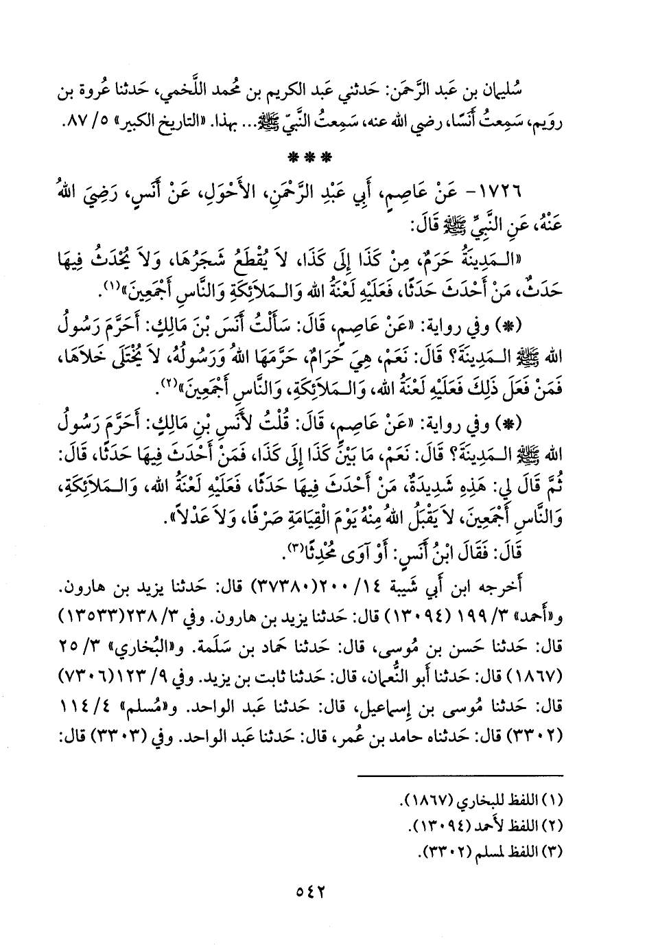 - وفي رواية: «عن عاصم، قال: قلت لأنس بن مالك: أحرم رسول الله صَلى الله عَليه وسَلم المدينة؟ قال: نعم، ما بين كذا إلى كذا، فمن أحدث فيها حدثا، قال: ثم قال لي: هذه شديدة، من أحدث فيها حدثا، فعليه لعنة الله، والملائكة، والناس أجمعين، لا يقبل الله منه يوم القيامة صرفا، ولا عدلا».