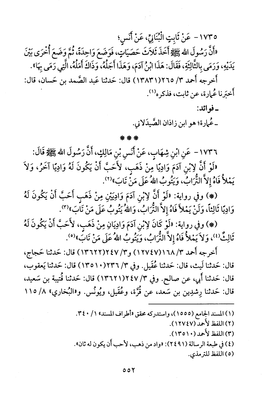 - وفي رواية: «لو أن لابن آدم واديا من ذهب، أحب أن يكون له واديان، ولن يملأ فاه إلا التراب، والله يتوب على من تاب» (¬٢).