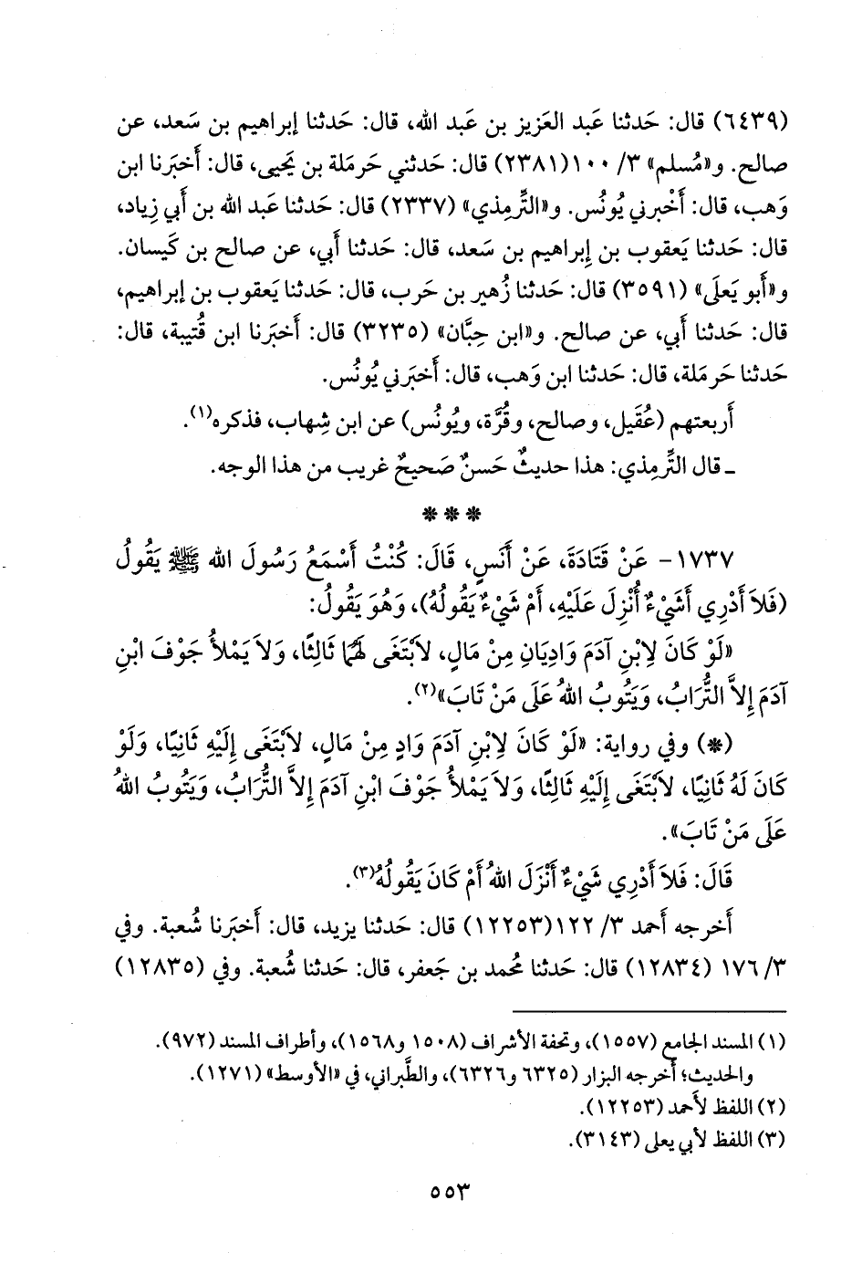 - وفي رواية: «لو كان لابن آدم واد من مال، لابتغى إليه ثانيا، ولو كان له ثانيا، لابتغى إليه ثالثا، ولا يملأ جوف ابن آدم إلا التراب، ويتوب الله على من تاب».