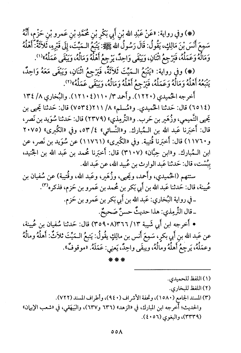 - أخرجه ابن أبي شيبة (٣٥٩٠٨) قال: حدثنا سفيان بن عُيينة، عن عبد الله بن أَبي بكر، سمع أَنس بن مالك يقول: يتبع الميت ثلاث: أهله وماله وعمله، يرجع أهله وماله، ويبقى واحد، يعني: عمله. «موقوف».