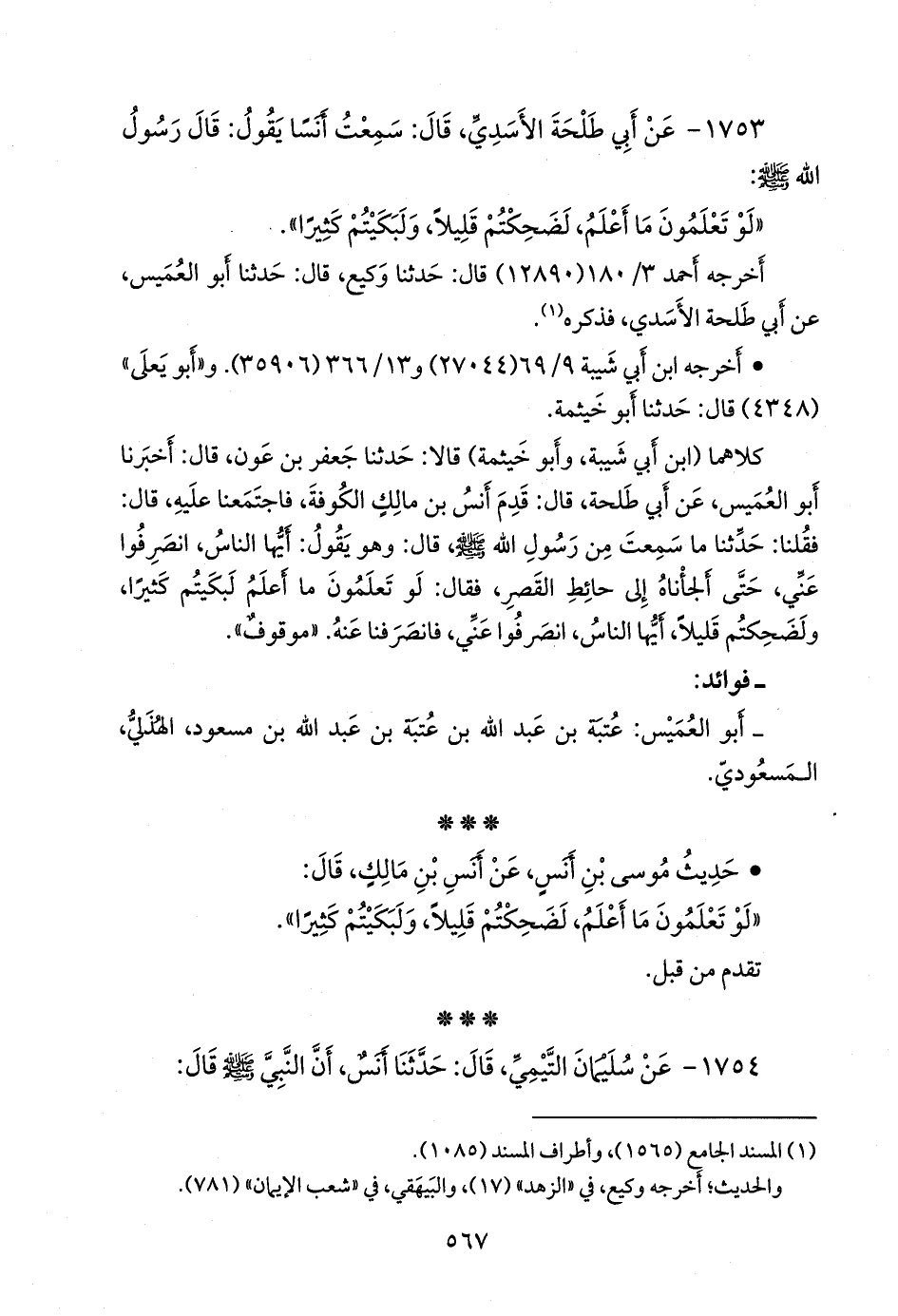 كلاهما (أَبو بكر بن أَبي شيبة، وأَبو خيثمة زهير بن حرب) عن جعفر بن عون، قال: أَخبرنا أَبو العُمَيس، عن أَبي طلحة، قال: قَدِمَ أَنس بن مالك الكوفة، فاجتمعنا عليه، قال: فقلنا: حَدِّثنا ما سَمِعتَ من رسول الله صَلى الله عَليه وسَلم قال: وهو يقول: أَيها الناس، انصرفوا عني، حتى أَلجأْناه إِلى حائط القصر، فقال: لو تعلمون ما أَعلم لبكيتم كثيرًا، ولضحكتم قليلًا، أَيها الناس، انصرفوا عني، فانصرفنا عنه (¬٢).