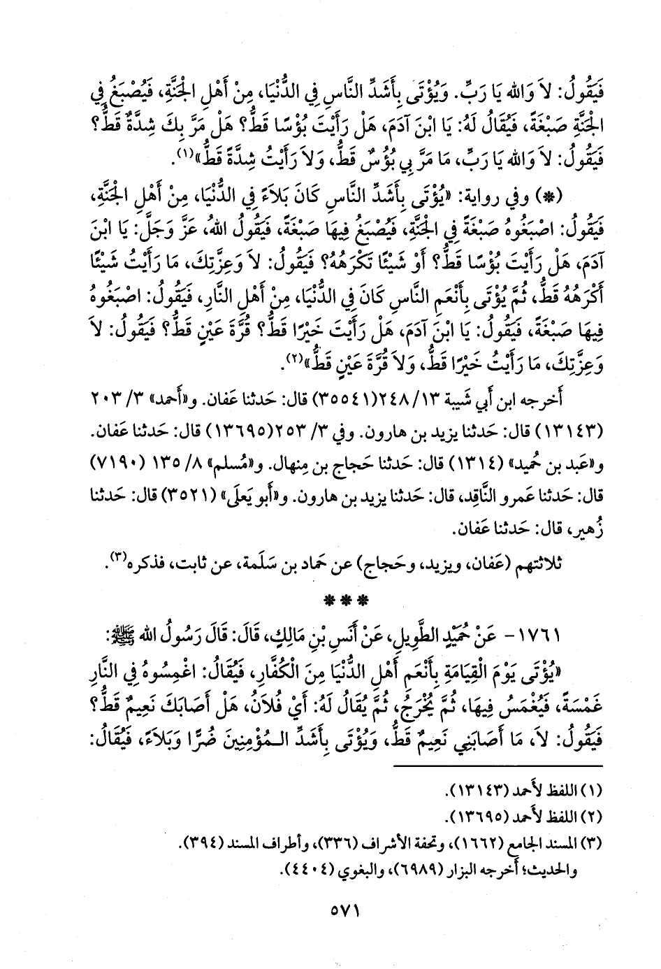 «يؤتى يوم القيامة بأنعم أهل الدنيا من الكفار، فيقال: اغمسوه في النار غمسة، فيغمس فيها، ثم يخرج، ثم يقال له: أي فلان، هل أصابك نعيم قط؟ فيقول: لا، ما أصابني نعيم قط، ويؤتى بأشد المؤمنين ضرا وبلاء، فيقال: