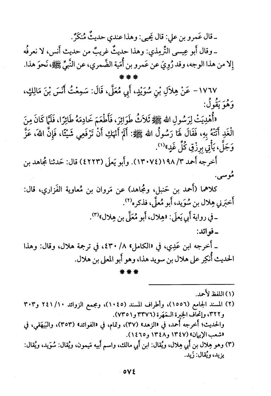 كلاهما (أحمد بن حنبل، ومجاهد) عن مروان بن معاوية الفزاري، قال: أخبرني هلال بن سويد، أَبو معلى، فذكره (¬٢).