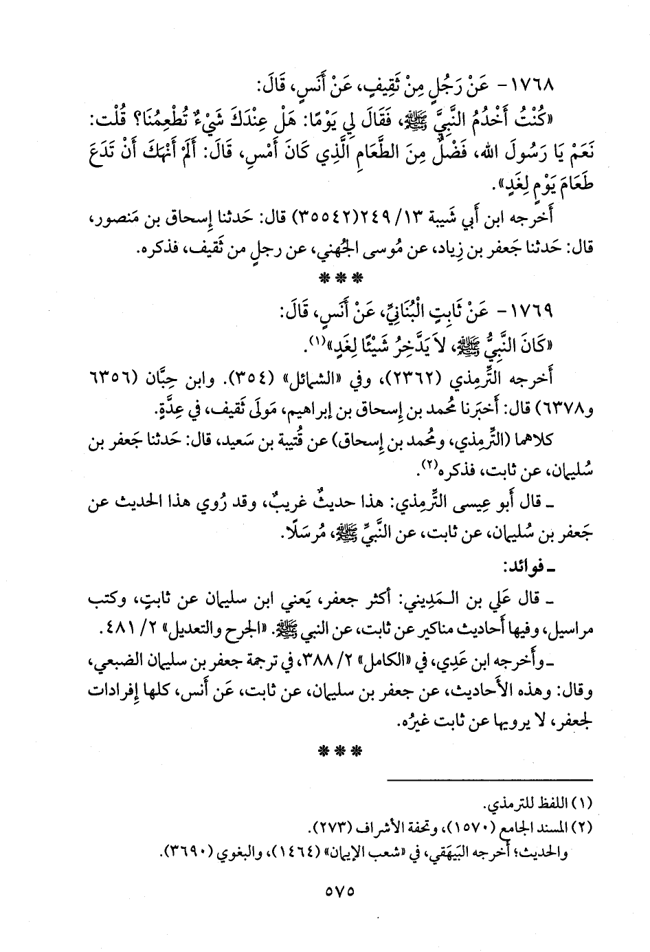 - وأخرجه ابن عَدي في «الكامل» ٢/ ٣٨٨، في مناكير جعفر بن سليمان الضبعي، وقال: وهذه الأحاديث، عن جعفر بن سليمان، عن ثابت، عن أَنس، كلها إفرادات لجعفر، لا يرويها عن ثابت غيره.