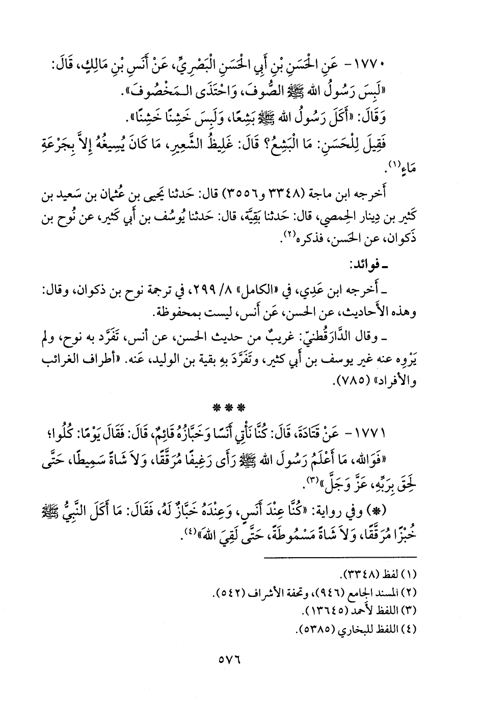 - وفي رواية: «كنا عند أنس، وعنده خباز له، فقال: ما أكل النبي صَلى الله عَليه وسَلم خبزا مرققا، ولا شاة مسموطة، حتى لقي الله» (¬٢).