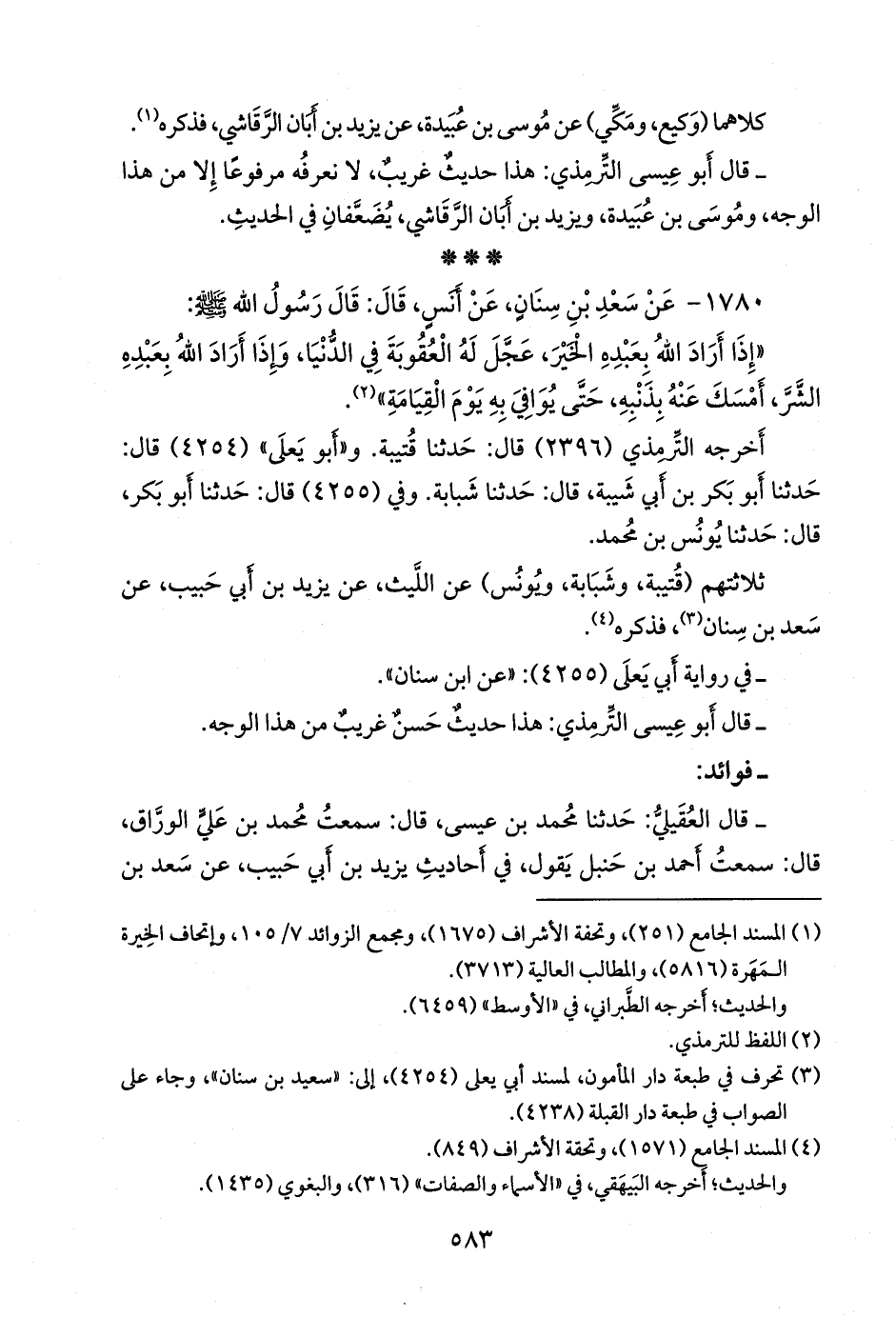 - قلنا: إِسناده ضعيفٌ؛ يزيد بن أَبَان الرَّقَاشي متروك الحديث. انظر فوائد الحديث رقم (٣١٦).