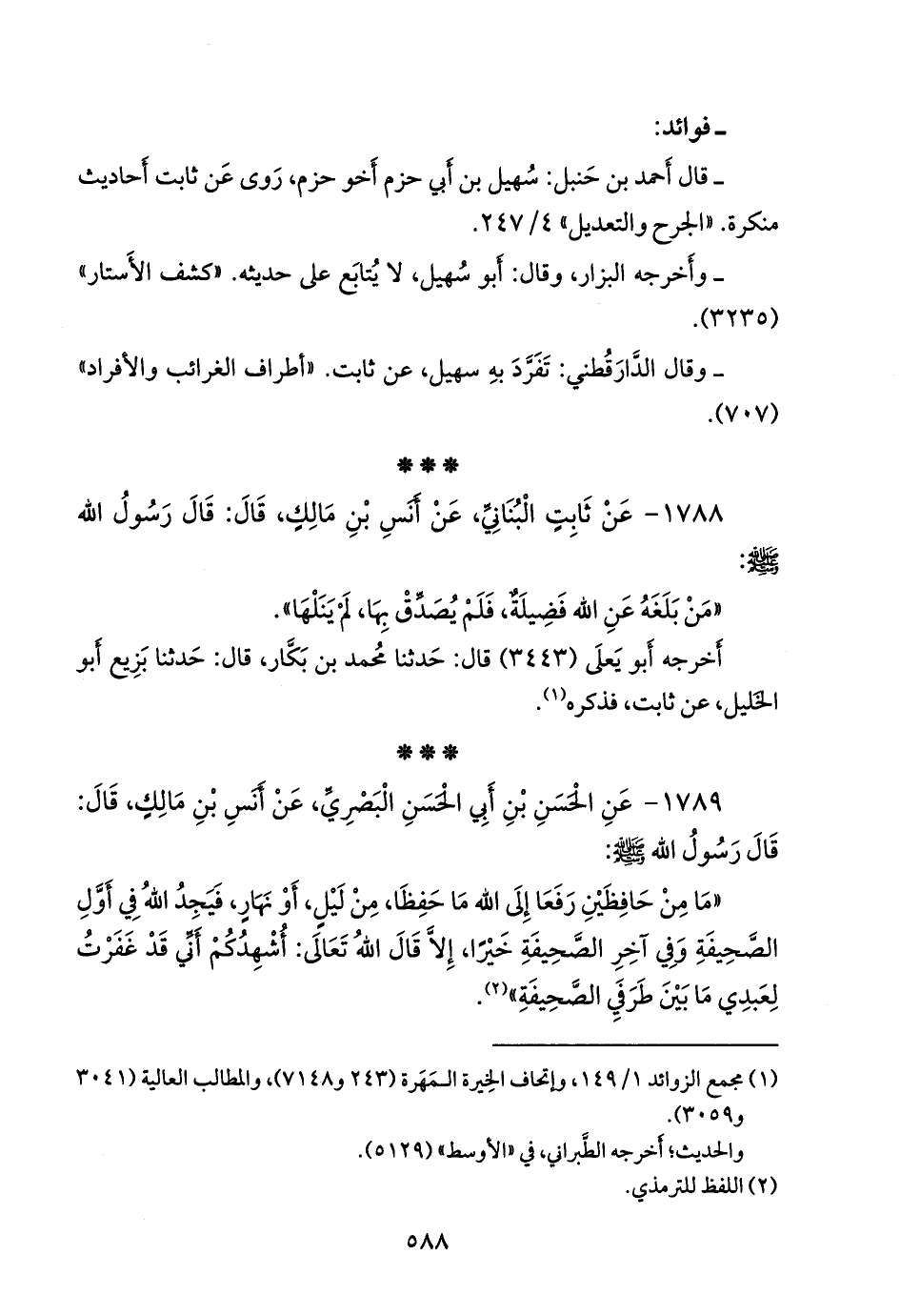- وقال الدارَقُطني: تَفرَّد به سهيل، عن ثابت. «أطراف الغرائب والأفراد» (٧٠٧).