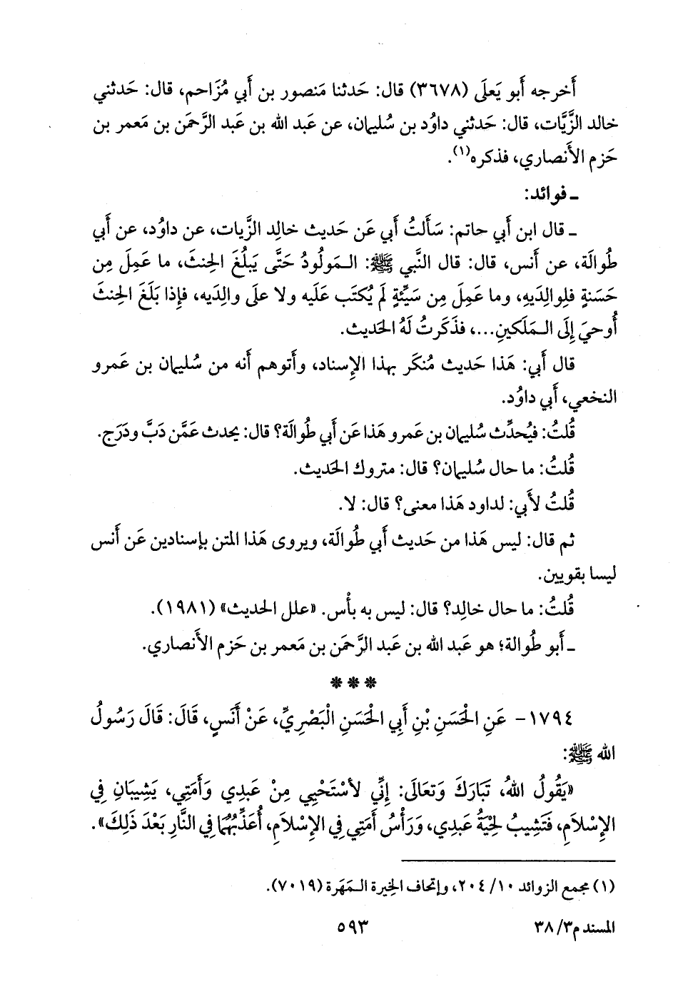 - قلنا: إِسناده ضعيفٌ؛ قال ابن أبي حاتم: سألت أبي عن حديث خالد الزيات، عن داود، عن أبي طُوالة، عن أَنس، قال: قال النبي صَلى الله عَليه وسَلم: المولود حتى يبلغ الحنث، ما عمل من حسنة فلوالديه، وما عمل من سيئة لم يكتب عليه ولا على والديه، فإذا بلغ الحنث أوحي إلى الملكين، فذكرت له الحديث.