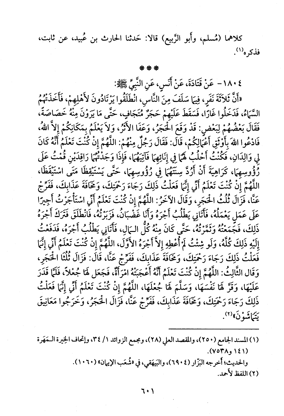 «أن ثلاثة نفر، فيما سلف من الناس، انطلقوا يرتادون لأهلهم، فأخذتهم السماء، فدخلوا غارا، فسقط عليهم حجر متجاف، حتى ما يرون منه خصاصة، فقال بعضهم لبعض: قد وقع الحجر، وعفا الأثر، ولا يعلم بمكانكم إلا الله، فادعوا الله بأوثق أعمالكم، قال: فقال رجل منهم: اللهم إن كنت تعلم أنه كان لي والدان، فكنت أحلب لهما في إنائهما فآتيهما، فإذا وجدتهما راقدين قمت على رؤوسهما، كراهية أن أرد سنتهما في رؤوسهما، حتى يستيقظا متى استيقظا، اللهم إن كنت تعلم أني إنما فعلت ذلك رجاء رحمتك، ومخافة عذابك، ففرج عنا، فزال ثلث الحجر، وقال الآخر: اللهم إن كنت تعلم أني استأجرت أجيرا على عمل يعمله، فأتاني يطلب أجره وأنا غضبان، فزبرته، فانطلق فترك أجره ذلك، فجمعته وثمرته، حتى كان منه كل المال، فأتاني يطلب أجره، فدفعت إليه ذلك كله، ولو شئت لم أعطه إلا أجره الأول، اللهم إن كنت تعلم أني إنما فعلت ذلك رجاء رحمتك، ومخافة عذابك، ففرج عنا، قال: فزال ثلثا الحجر، وقال الثالث: اللهم إن كنت تعلم أنه أعجبته امرأة، فجعل لها جعلا، فلما قدر عليها، وَفَّرَ لها نفسها، وسلم لها جعلها، اللهم إن كنت تعلم أني إنما فعلت ذلك رجاء رحمتك، ومخافة عذابك، ففرج عنا، فزال الحجر، وخرجوا معانيق يتماشون» (¬١).