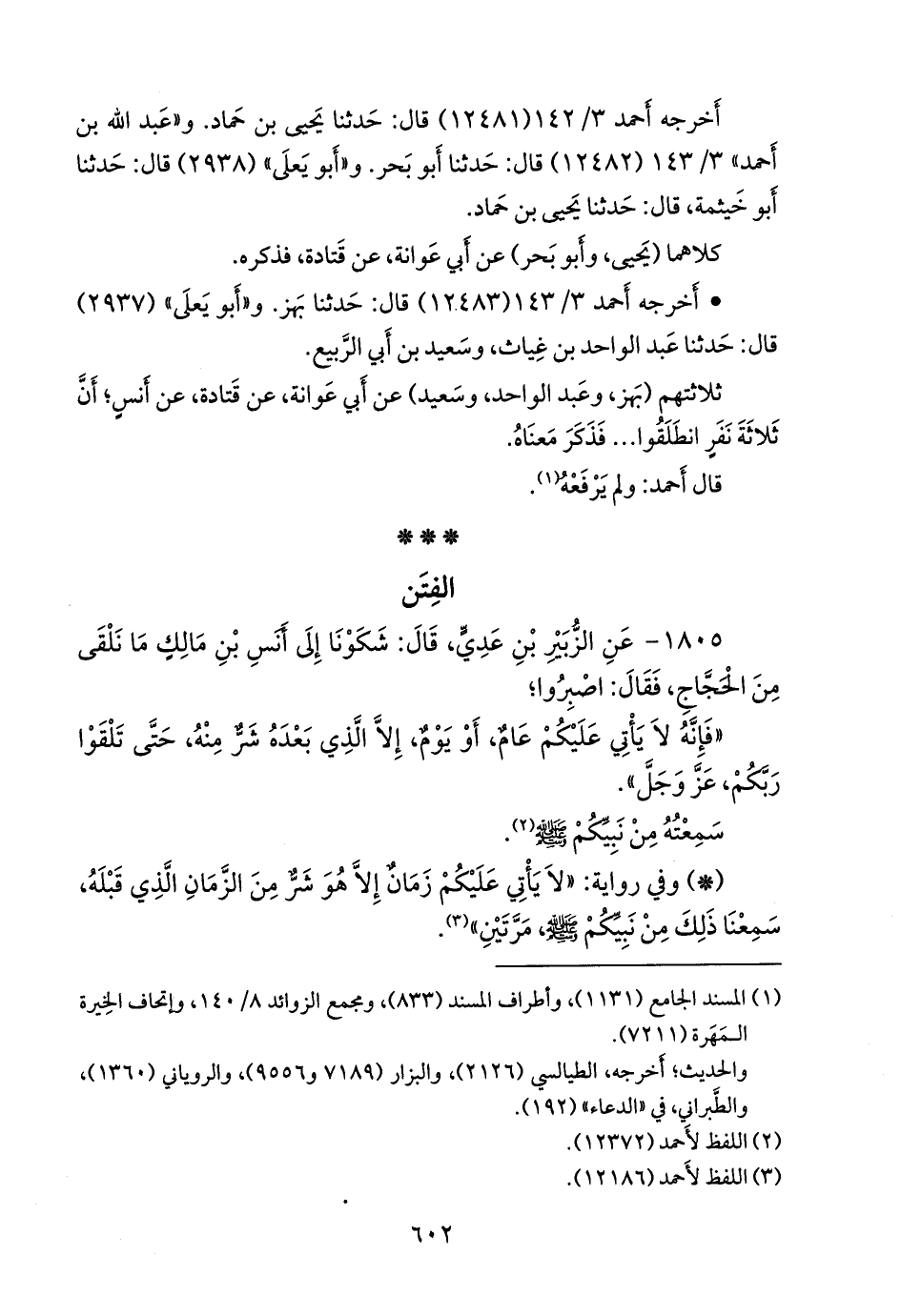 ١٨٠٥ - عن الزبير بن عَدي، قال: شكونا إلى أَنس بن مالك ما نلقى من الحجاج، فقال: اصبروا؛