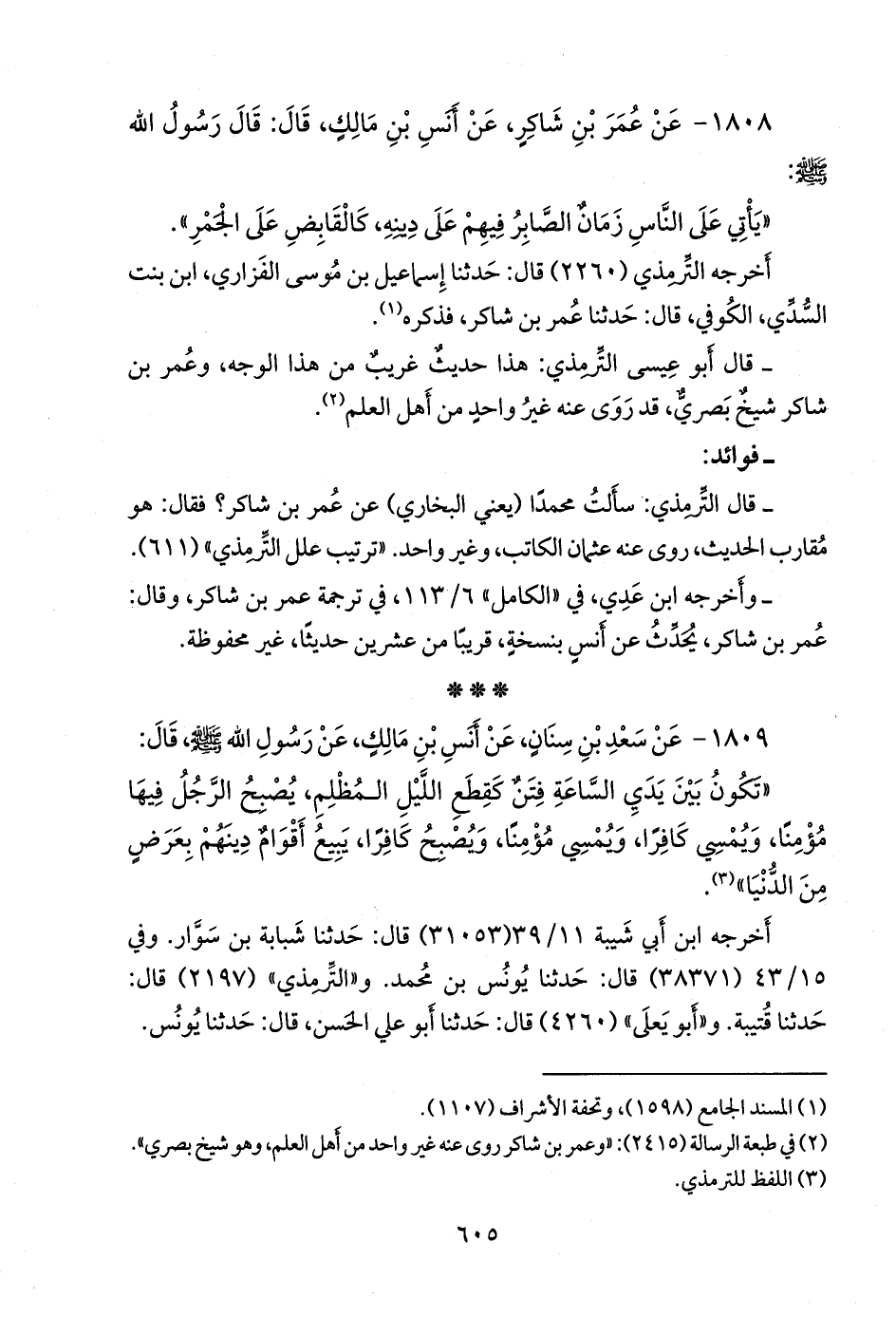 - قال التِّرمِذي: هذا حديثٌ غريبٌ من هذا الوجه، وعمر بن شاكر روى عنه غيرُ واحد من أَهل العلم، وهو شيخٌّ بصريٌّ.