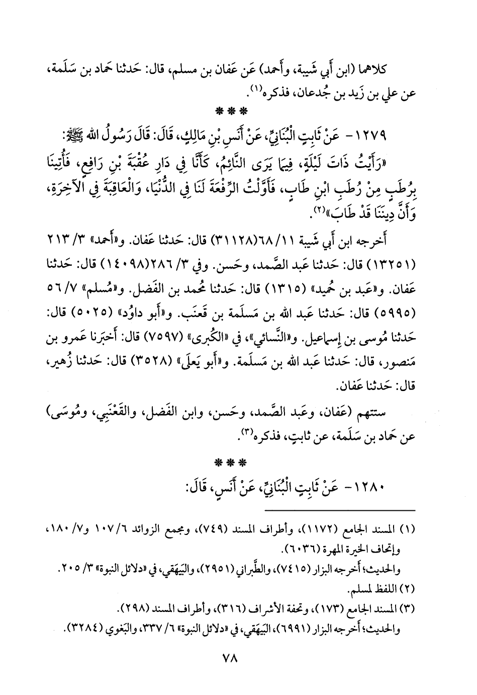 ستتهم (عفان، وعبد الصمد، وحسن، وابن الفضل، والقَعنَبي، وموسى) عن حماد بن سلمة، عن ثابت البُنَاني، فذكره (¬٢).
