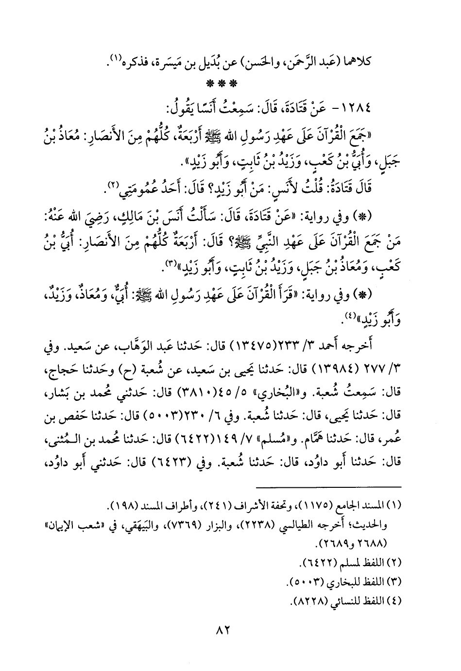 «جمع القرآن على عهد رسول الله صَلى الله عَليه وسَلم أربعة، كلهم من الأنصار: معاذ بن جبل، وأُبي بن كعب، وزيد بن ثابت، وأَبو زيد».