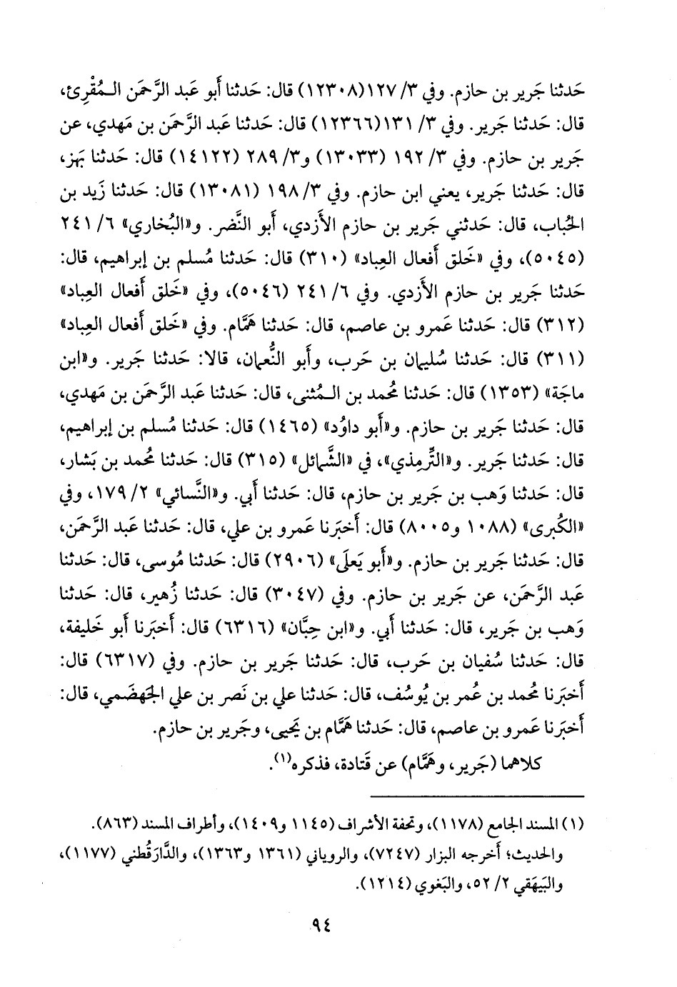 وفي ٦/ ١٩٥ (٥٠٤٦)، وفي «خلق أفعال العباد» (٣١٢) قال: حدثنا عَمرو بن عاصم، قال: حدثنا همام. وفي «خلق أفعال العباد» (٣١١) قال: حدثنا سليمان بن حرب، وأَبو النعمان، قالا: حدثنا جَرير. و «ابن ماجة» (١٣٥٣) قال: حدثنا محمد بن المثنى، قال: حدثنا عبد الرَّحمَن بن مهدي، قال: حدثنا جَرير بن حازم. و «أَبو داود» (١٤٦٥) قال: حدثنا مسلم بن إبراهيم، قال: حدثنا جَرير. و «التِّرمِذي» في «الشمائل» (٣١٥) قال: حدثنا محمد بن بشار، قال: حدثنا وهب بن جَرير بن حازم، قال: حدثنا أبي. و «النَّسَائي» ٢/ ١٧٩، وفي «الكبرى» (١٠٨٨ و ٨٠٠٥) قال: أخبرنا عَمرو بن علي، قال: حدثنا عبد الرَّحمَن، قال: حدثنا جَرير بن حازم. و «أَبو يَعلى» (٢٩٠٦) قال: حدثنا موسى، قال: حدثنا عبد الرَّحمَن، عن جَرير بن حازم. وفي (٣٠٤٧) قال: حدثنا زهير، قال: حدثنا وهب بن جرير، قال: حدثنا أبي. و «ابن حِبَّان» (٦٣١٦) قال: أخبرنا أَبو خليفة، قال: حدثنا سفيان بن حرب، قال: حدثنا جَرير بن حازم. وفي (٦٣١٧) قال: أخبرنا محمد بن عمر بن يوسف، قال: حدثنا علي بن نصر بن علي الجهضمي، قال: أخبرنا عَمرو بن عاصم، قال: حدثنا همام بن يحيى، وجرير بن حازم.