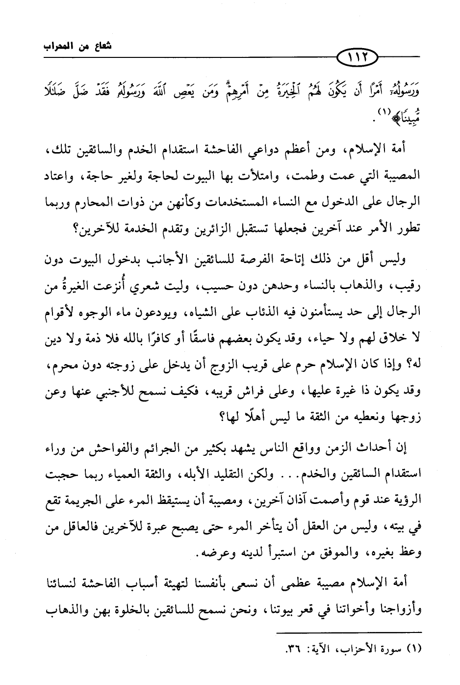 وليس أقل من ذلك إتاحة الفرصة للسائقين الأجانب بدخول البيوت دون رقيب، والذهاب بالنساء وحدهن دون حسيب، وليت شعري أُنزعت الغيرةُ من الرجال إلى حد يستأمنون فيه الذئاب على الشياه، ويودعون ماء الوجوه لأقوام لا خلاق لهم ولا حياء، وقد يكون بعضهم فاسقًا أو كافرًا بالله فلا ذمة ولا دين له؟ وإذا كان الإسلام حرم على قريب الزوج أن يدخل على زوجته دون محرم، وقد يكون ذا غيرة عليها، وعلى فراش قريبه، فكيف نسمح للأجنبي عنها وعن زوجها ونعطيه من الثقة ما ليس أهلاً لها؟