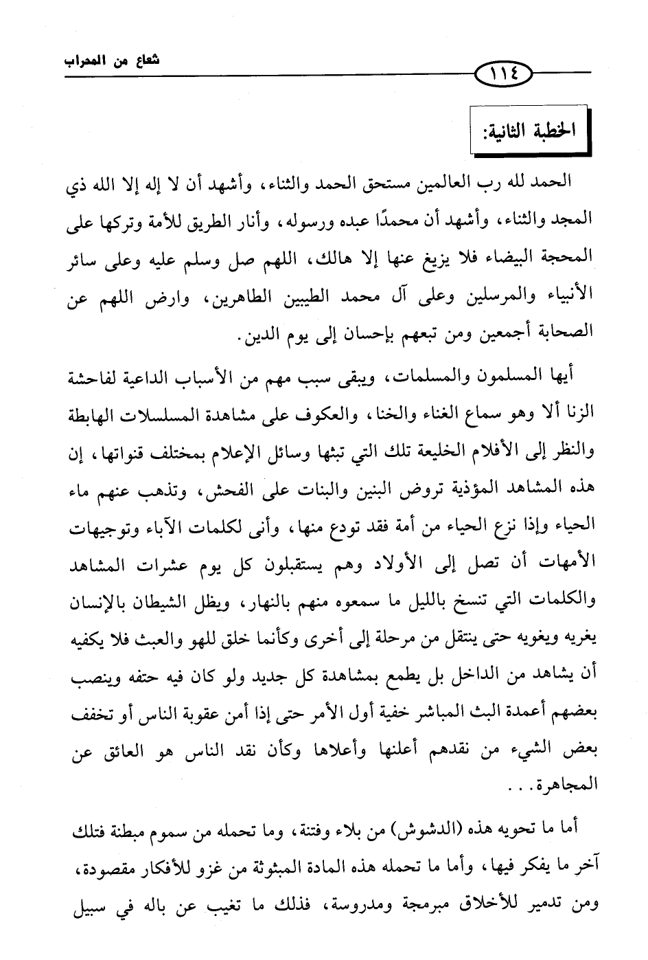 أيها المسلمون والمسلمات، ويبقى سبب مهم من الأسباب الداعية لفاحشة الزنا ألا وهو سماع الغناء والخنا، والعكوف على مشاهدة المسلسلات الهابطة والنظر إلى الأفلام الخليعة تلك التي تبثها وسائل الإعلام بمختلف قنواتها، إن هذه المشاهد المؤذية تروض البنين والبنات على الفحش، وتذهب عنهم ماء الحياء وإذا نزع الحياء من أمة فقد تودع منها، وأنى لكلمات الآباء وتوجيهات الأمهات أن تصل إلى الأولاد وهم يستقبلون كل يوم عشرات المشاهد والكلمات التي تنسخ بالليل ما سمعوه منهم بالنهار، ويظل الشيطان بالإنسان يغريه ويغويه حتى ينتقل من مرحلة إلى أخرى وكأنما خلق للهو والعبث فلا يكفيه أن يشاهد من الداخل بل يطمع بمشاهدة كل جديد ولو كان فيه حتفه وينصب بعضهم أعمدة البث المباشر خفية أول الأمر حتى إذا أمن عقوبة الناس أو تخفف بعض الشيء من نقدهم أعلنها وأعلاها وكأن نقد الناس هو العائق عن المجاهرة ...