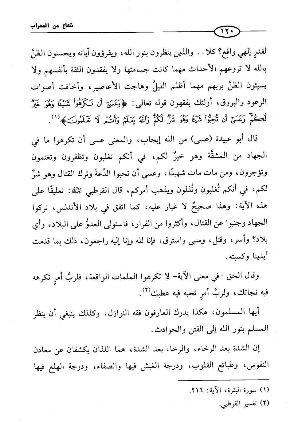 لقدرٍ إلهي واقع؟ كلا .. والذين ينظرون بنور الله، ويقرؤون آياته ويحسنون الظنَّ بالله لا تروعهم الأحداث مهما كانت جسامتها ولا يفقدون الثقة بأنفسهم ولا يسيئون الظنَّ بربهم مهما أظلم الليلُ وهاجت الأعاصير، وأخافت أصوات الرعود والبروق، أولئك يفقهون قوله تعالى: {وَعَسَى أَن تَكْرَهُوا شَيْئاً وَهُوَ خَيْرٌ لَّكُمْ وَعَسَى أَن تُحِبُّوا شَيْئاً وَهُوَ شَرٌّ لَّكُمْ وَاللَّهُ يَعْلَمُ وَأَنتُمْ لاَ تَعْلَمُونَ} (¬1).