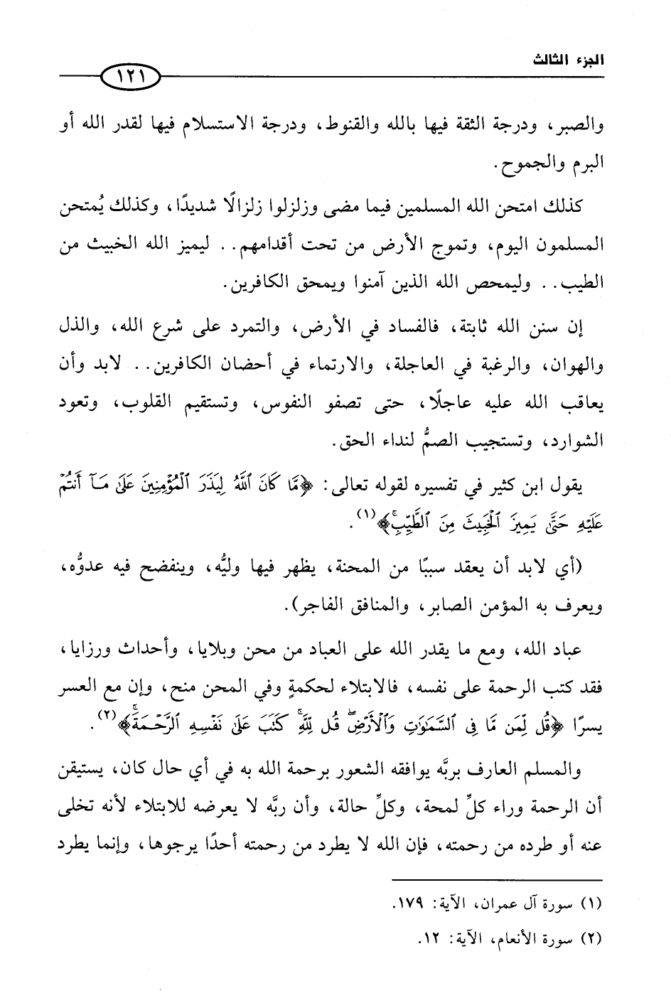 يقول ابن كثير في تفسيره لقوله تعالى: {مَّا كَانَ اللَّهُ لِيَذَرَ الْمُؤْمِنِينَ عَلَى مَآ أَنتُمْ عَلَيْهِ حَتَّىَ يَمِيزَ الْخَبِيثَ مِنَ الطَّيِّبِ} (¬1).