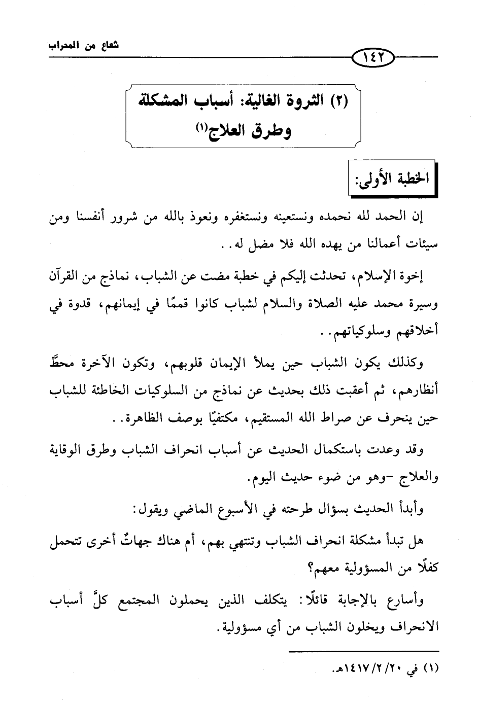 وكذلك يكون الشباب حين يملأ الإيمان قلوبهم، وتكون الآخرة محطَّ أنظارهم، ثم أعقبت ذلك بحديث عن نماذج من السلوكيات الخاطئة للشباب حين ينحرف عن صراط الله المستقيم، مكتفيًا بوصف الظاهرة ..