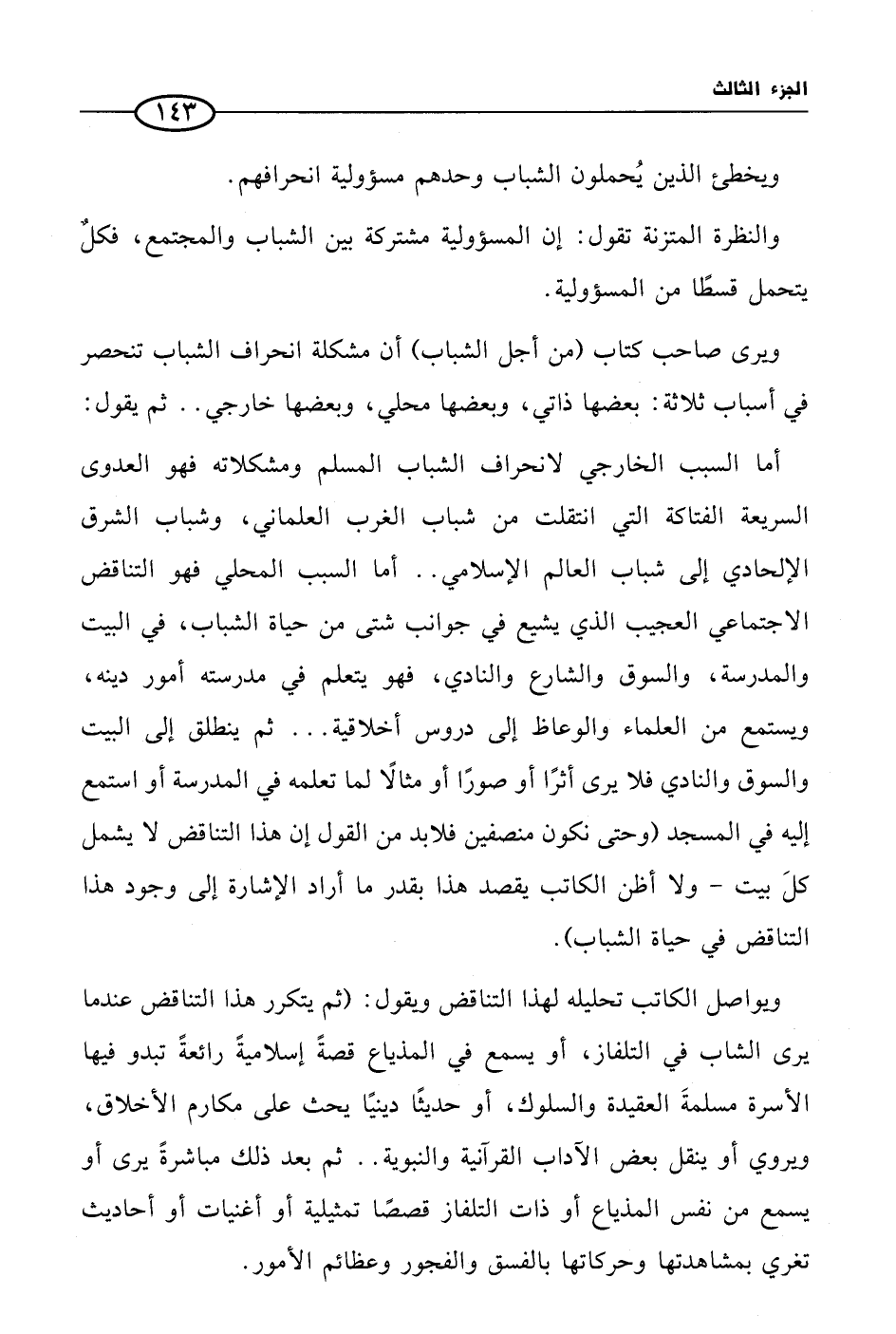 ويواصل الكاتب تحليله لهذا التناقض ويقول: (ثم يتكرر هذا التناقض عندما يرى الشاب في التلفاز، أو يسمع في المذياع قصةً إسلاميةً رائعةً تبدو فيها الأسرة مسلمةَ العقيدة والسلوك، أو حديثًا دينيًا يحث على مكارم الأخلاق، ويروي أو ينقل بعض الآداب القرآنية والنبوية .. ثم بعد ذلك مباشرةً يرى أو يسمع من نفس المذياع أو ذات التلفاز قصصًا تمثيلية أو أغنيات أو أحاديث تغري بمشاهدتها وحركاتها بالفسق والفجور وعظائم الأمور.