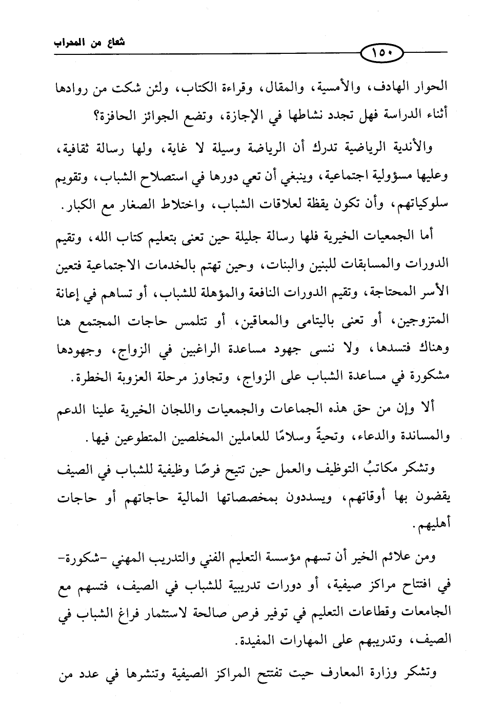 وتشكر مكاتبُ التوظيف والعمل حين تتيح فرصًا وظيفية للشباب في الصيف يقضون بها أوقاتهم، ويسددون بمخصصاتها المالية حاجاتهم أو حاجات أهليهم.
