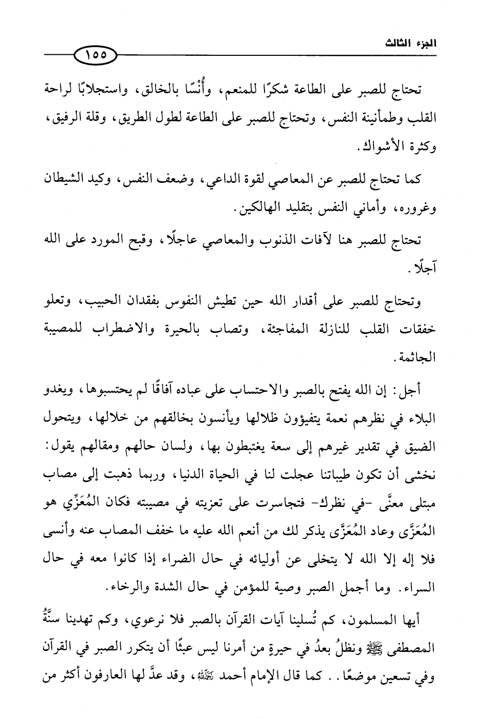 أيها المسلمون، كم تُسلينا آيات القرآن بالصبر فلا نرعوي، وكم تهدينا سنَّةُ المصطفى صلى الله عليه وسلم ونظلُ بعدُ في حيرةٍ من أمرنا ليس عبثًا أن يتكرر الصبر في القرآن وفي تسعين موضعًا .. كما قال الإمام أحمد رحمه الله، وقد عدَّ لها العارفون أكثر من