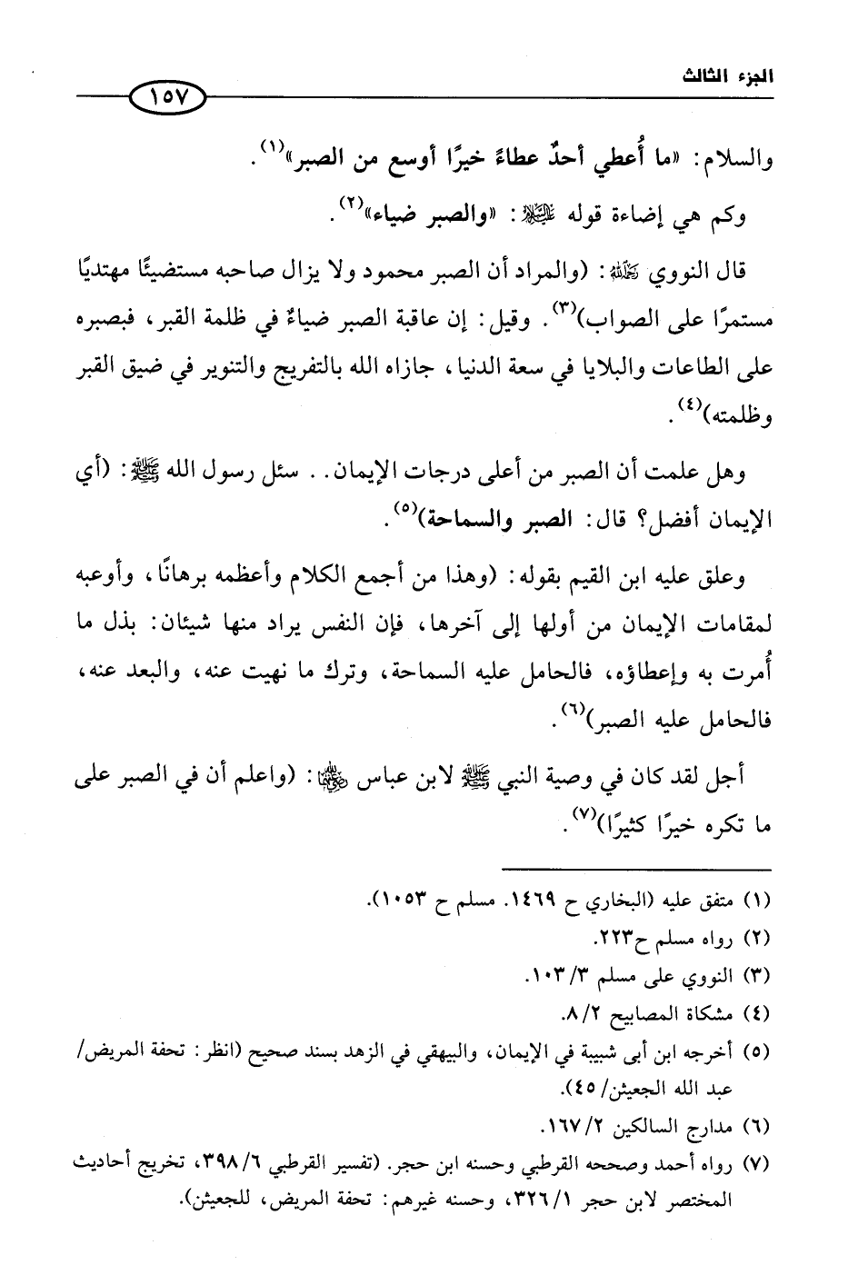 وكم هي إضاءة قوله عليه السلام: «والصبر ضياء» (¬2). قال النووي رحمه الله: (والمراد أن الصبر محمود ولا يزال صاحبه مستضيئًا مهتديًا مستمرًا على الصواب) (¬3). وقيل: إن عاقبة الصبر ضياءٌ في ظلمة القبر، فبصبره على الطاعات والبلايا في سعة الدنيا، جازاه الله بالتفريج والتنوير في ضيق القبر وظلمته) (¬4).