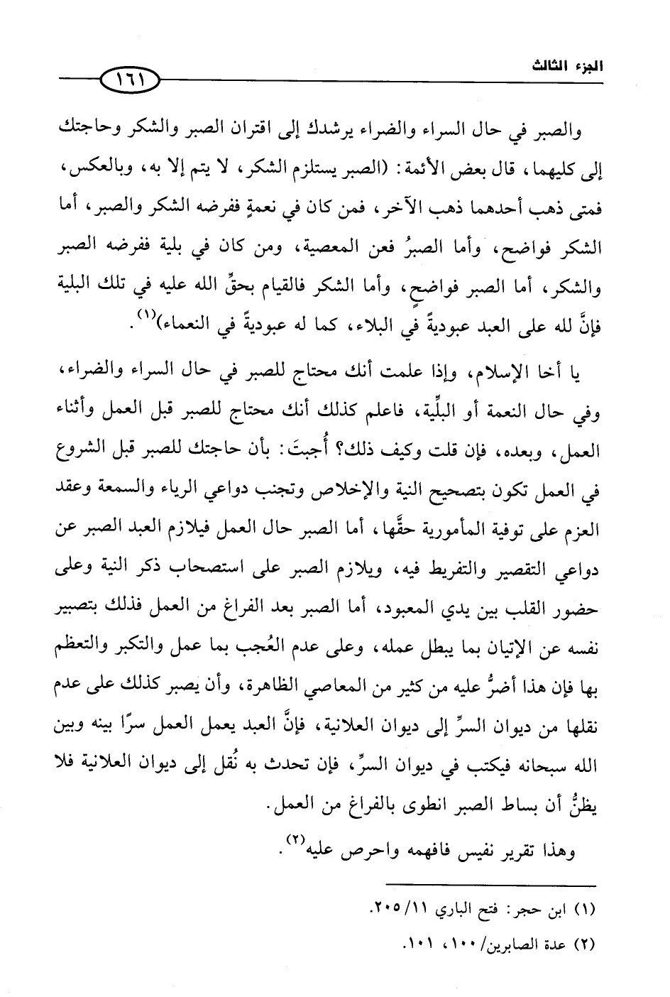 يا أخا الإسلام، وإذا علمت أنك محتاج للصبر في حال السراء والضراء، وفي حال النعمة أو البلِّية، فاعلم كذلك أنك محتاج للصبر قبل العمل وأثناء العمل، وبعده، فإن قلت وكيف ذلك؟ أُجبتَ: بأن حاجتك للصبر قبل الشروع في العمل تكون بتصحيح النية والإخلاص وتجنب دواعي الرياء والسمعة وعقد العزم على توفية المأمورية حقَّها، أما الصبر حال العمل فيلازم العبد الصبر عن دواعي التقصير والتفريط فيه، ويلازم الصبر على استصحاب ذكر النية وعلى حضور القلب بين يدي المعبود، أما الصبر بعد الفراغ من العمل فذلك بتصبير نفسه عن الإتيان بما يبطل عمله، وعلى عدم العُجب بما عمل والتكبر والتعظم بها فإن هذا أضرُّ عليه من كثير من المعاصي الظاهرة، وأن يصبر كذلك على عدم نقلها من ديوان السرِّ إلى ديوان العلانية، فإنَّ العبد يعمل العمل سرًا بينه وبين الله سبحانه فيكتب في ديوان السرِّ، فإن تحدث به نُقل إلى ديوان العلانية فلا يظنُّ أن بساط الصبر انطوى بالفراغ من العمل.